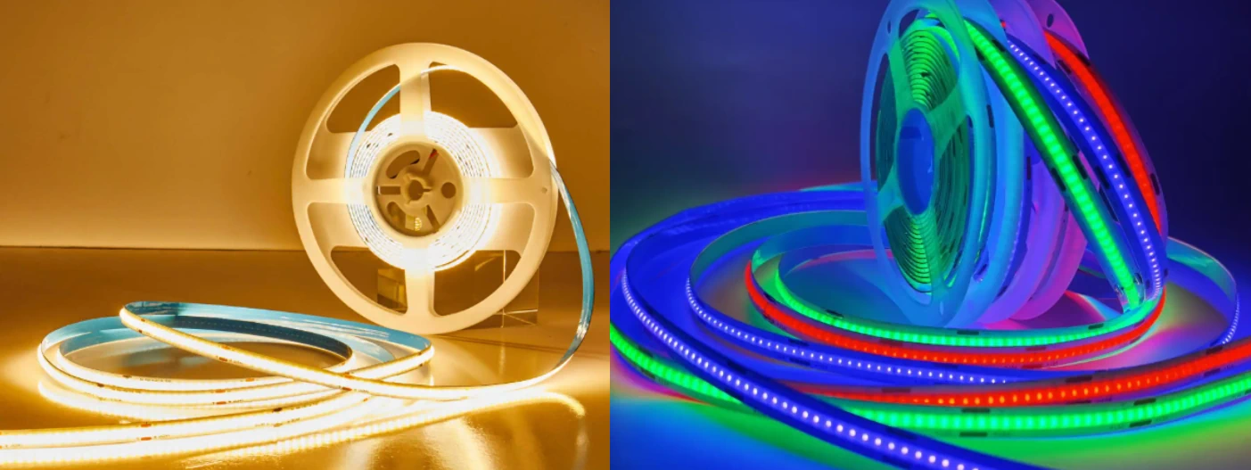 - Jednokolorowe (monochromatyczne) – świecą jednym pasmem światła, na przykład białym ciepłym 3000 K, neutralnym 4000 K, zimnym 6000 K albo jednym kolorem: czerwonym, zielonym czy niebieskim. Są proste w sterowaniu – włączanie, wyłączanie i ściemnianie – a przy tej samej mocy zwykle dają więcej światła niż RGB czy RGBW,