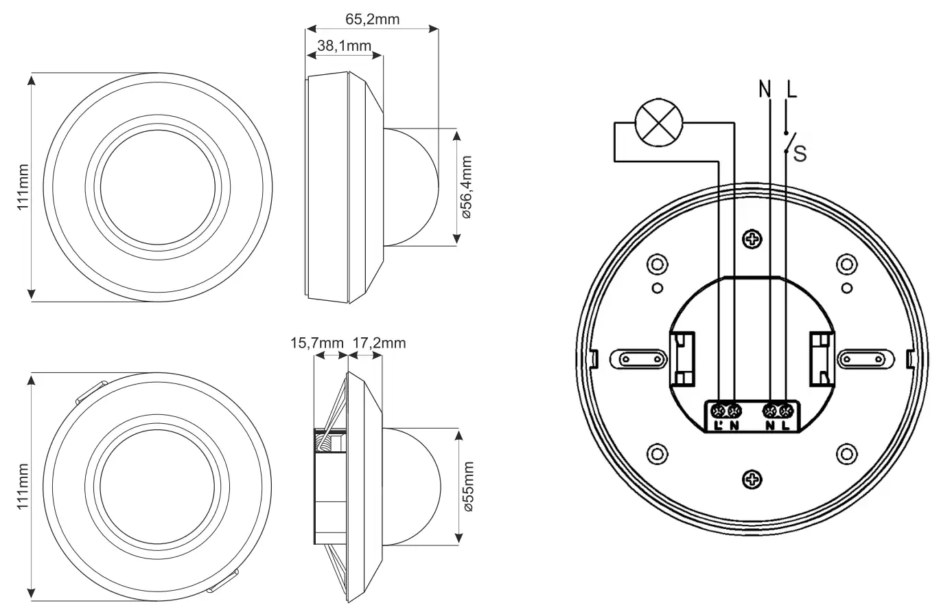 Montaż możliwy zarówno podtynkowo, jak i natynkowo (ściana/sufit), dzięki dodatkowej bazie montażowej. Obudowa z trwałego poliwęglanu oraz klasa szczelności IP44 zapewniają odporność na pył i wilgoć. Kompaktowe wymiary (Ø111 mm, głębokość montażowa 30 mm, średnica otworu 51 mm) umożliwiają dyskretną instalację.