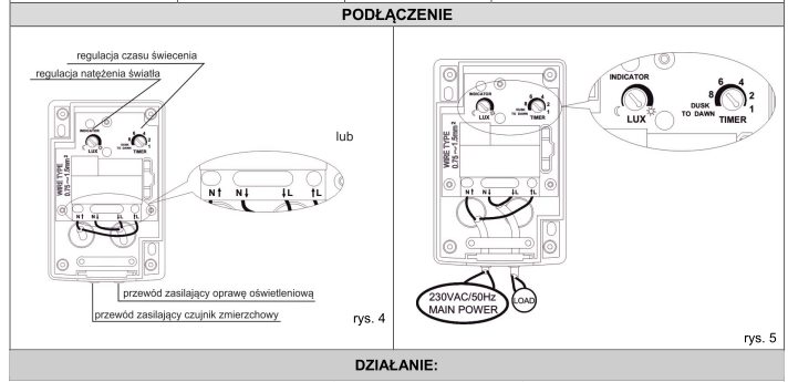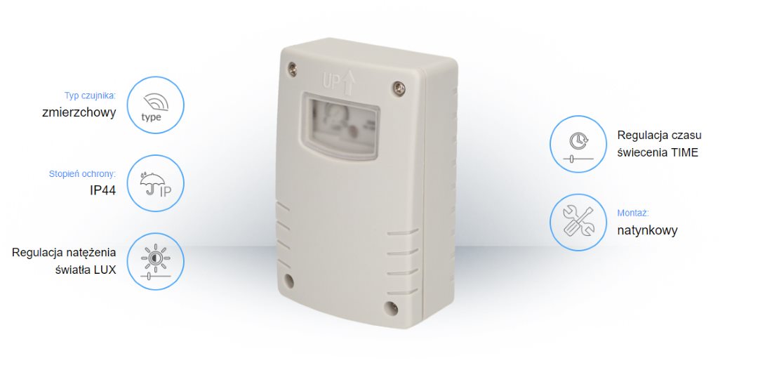 Urządzenie wyposażono w regulację czułości (zakres 2–200 luksów) oraz funkcję opóźnienia załączenia. Dzięki klasie szczelności IP44 nadaje się do montażu na zewnątrz, a prosta konstrukcja umożliwia szybki montaż na ścianie.