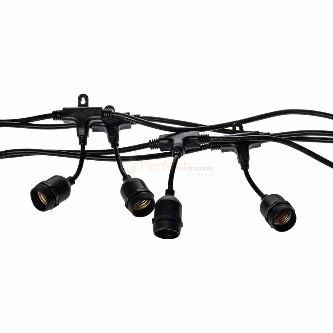Girlanda ogrodowa o długości całkowitej 15m w kolorze czarnym. Wyposażona w 15 gniazd z wodoodpornymi oprawkami E27 o łącznej długości 15 metrów. Brak żarówek w komplecie.