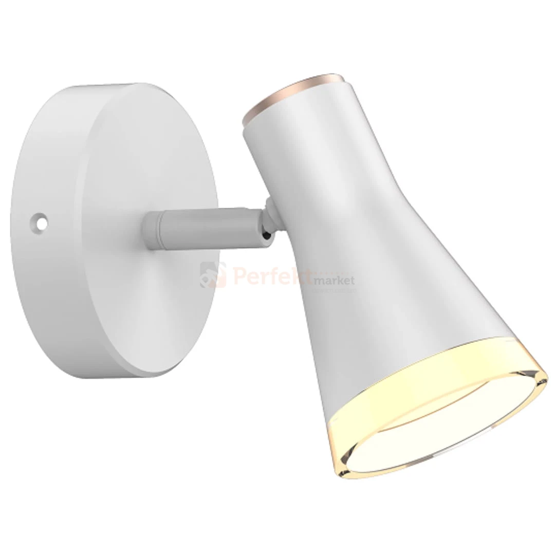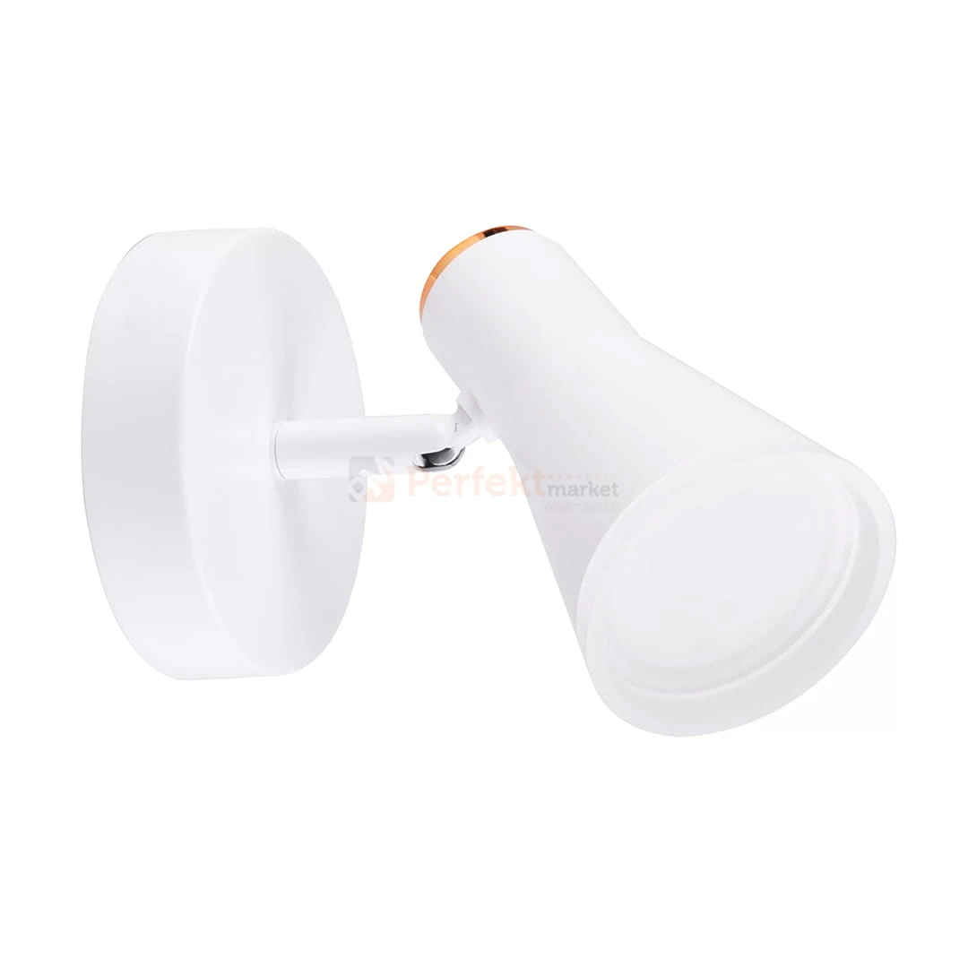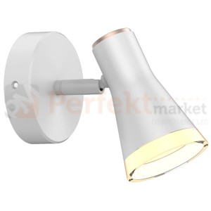 Lampa ścienna o prostej skandynawskiej formie w kolorze białym z pięknym złotym ringiem u nasady i matowym wykończeniu. Prosty elegancki regulowany reflektorek wykonany został z wysokiej jakości stali. Idealnie pasuje do wnętrz w stylu nowoczesnym, minimalistycznym. Niezwykle atrakcyjny wygląd połączony został z wysokim standardem wykonania. Regulowany kinkiet z niewymiennym źródłem światła ma moc 4,2W i przyjemną ciepłą barwę światła 3000K.