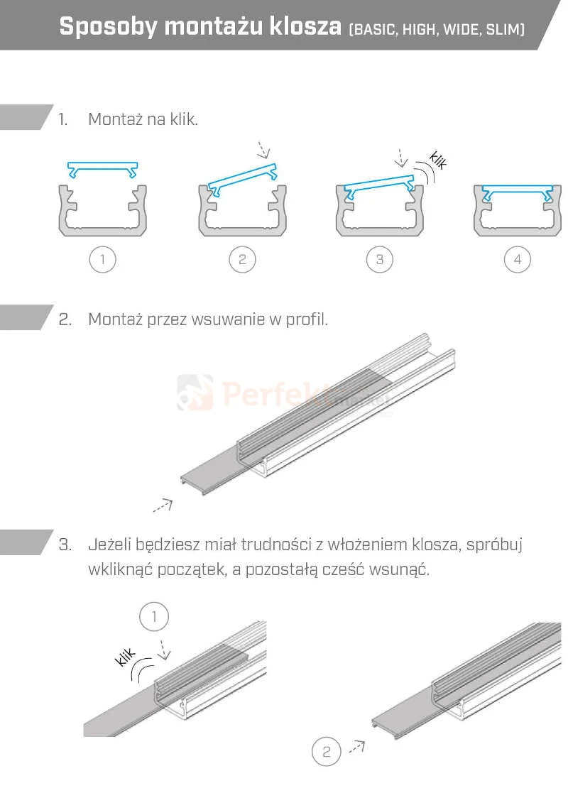 - mleczna - biała przesłonka - wnętrze profilu jest niewidoczne, bardzo dobrze rozprasza punkty świetlne.