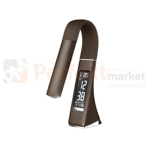 Elegancka biznesowa lampa biurkowa LED wykończona imitacją skóry w kolorze brązowym. Na ekranie widnieje godzina, data oraz temperatura pomieszczenia w którym znajduje się lampa. Elastyczne ramię i stabilna podstawa pozwalają na ustawienie lampy w optymalnej pozycji. Źródło światła LED. Maksymalna moc świecenia 6W. Wyposażona w dotykowy bardzo czuły sensor dzięki czemu bardzo intuicyjnie możemy zarówno włączać lampkę jak i regulować poziom intensywności świecenia - trzy stopnie jasności. Rozproszone i równomierne światło pozwoli nam na długą pracę przy świetle lampy LED bez zmęczenia i w pełnym komforcie dla naszych oczu.
