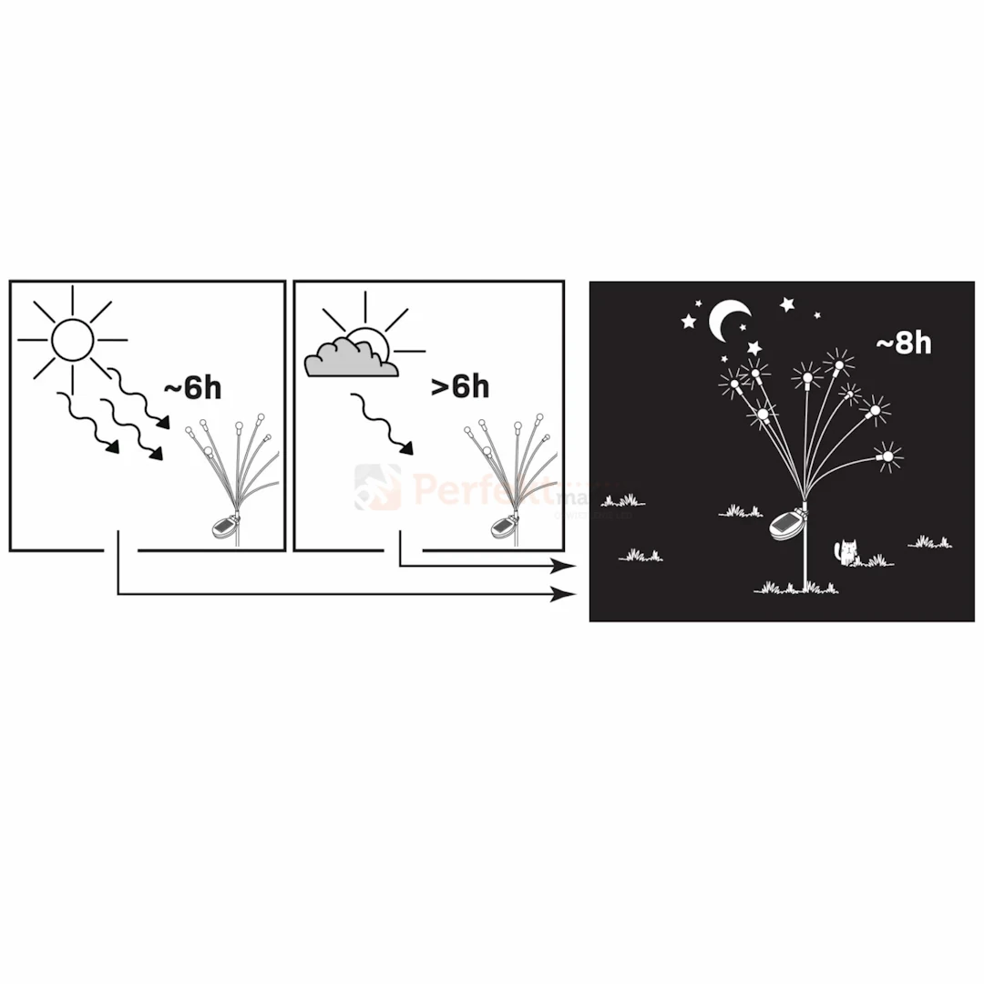 Lampa solarna ogrodowa FIORINI 8 LED to doskonałe rozwiązanie, które nie tylko zdobi Twój ogród, ale także pomaga obniżyć rachunki za energię elektryczną. Dzięki delikatnemu, dekoracyjnemu oświetleniu, tworzy ona magiczną atmosferę, która zachwyca zarówno latem, jak i zimą. Idealnie nadają się do oświetlenia tarasów oraz eksponowania elementów małej architektury ogrodowej, a także mogą stanowić piękne uzupełnienie kompozycji roślinnych.