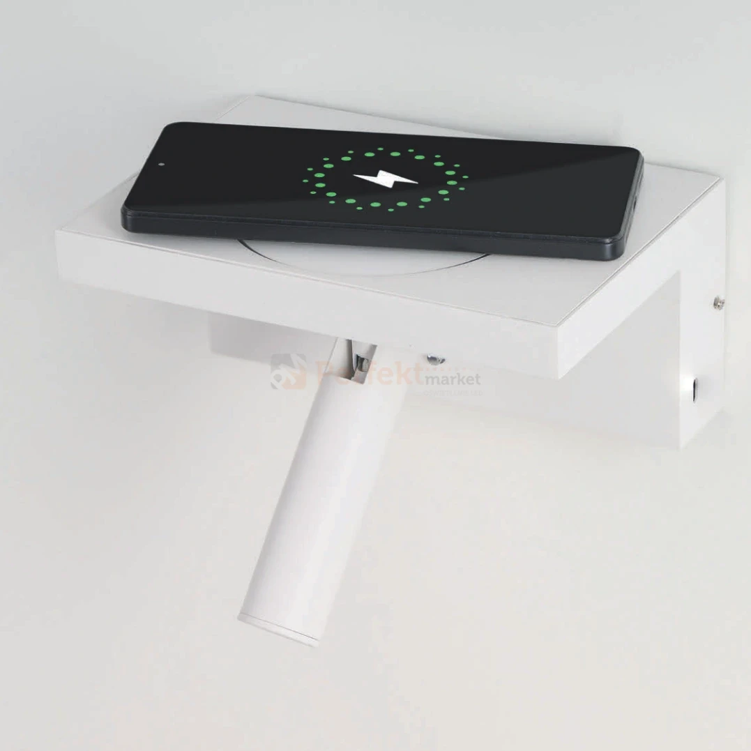 Funkcjonalna lampa ścienna w formie kinkietu z półką i ładowarką bezprzewodową (indukcyjną) z szybkim ładowaniem. Dodatkowo kinkiet wyposażony w gniazdo USB również możliwością ładowania po przewodzie.