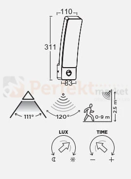 Lampa wyposażona w czujnik ruchu PIR o kącie detekcji 120° i odległości wykrywania ruchu do 9 metrów.