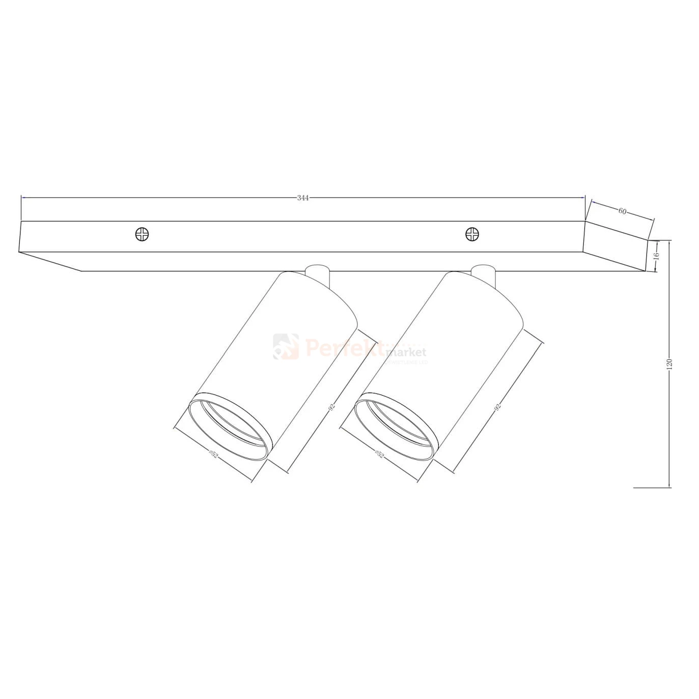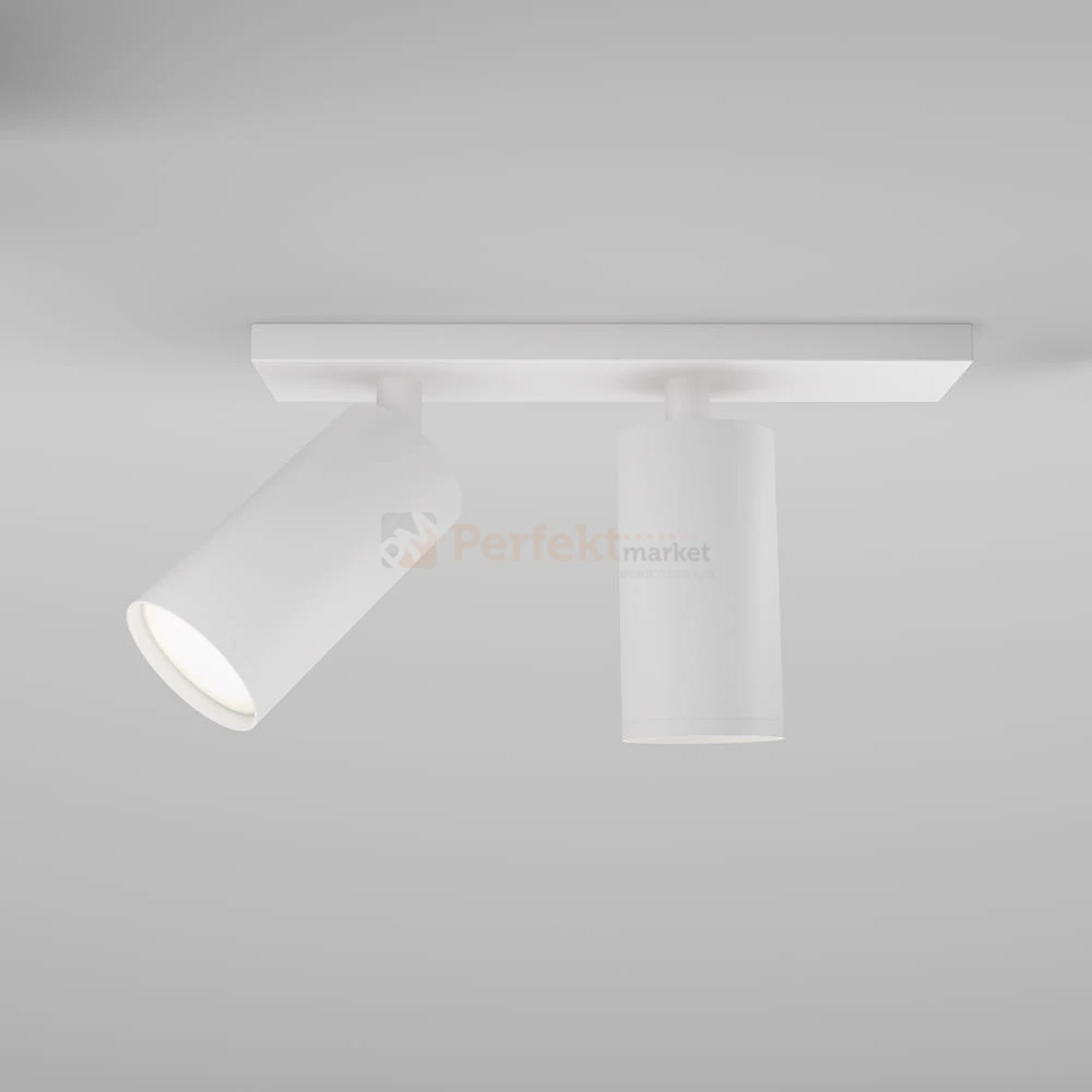 Nowoczesna lampa sufitowa z 2 regulowanymi spotami w kolorze białym. Możliwość montażu sufitowego jako plafon lub ściennego jako kinkiet.