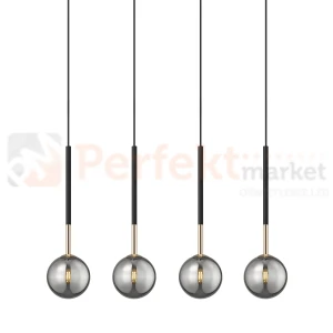 Nowoczesna, minimalistyczna i wyrafinowana – lampa wisząca ARCTURUS z czterema dymionymi szklanymi kloszami to propozycja, która wyróżnia się nie tylko formą, ale i starannie dobranymi detalami. Jej konstrukcja opiera się na eleganckim czarno-złotym profilu, z którego zwisają czarne przewody zakończone dymionymi, szklanymi kloszami o średnicy 12 cm. Całość dopełnia dyskretna, czarna podsufitka, która zapewnia estetyczne wykończenie całej instalacji.