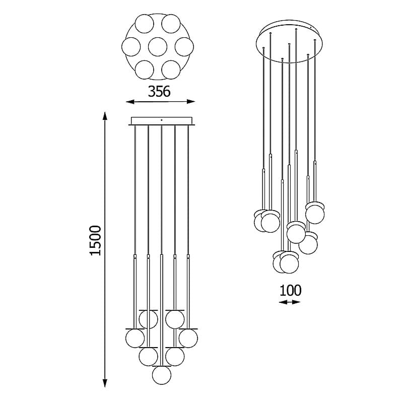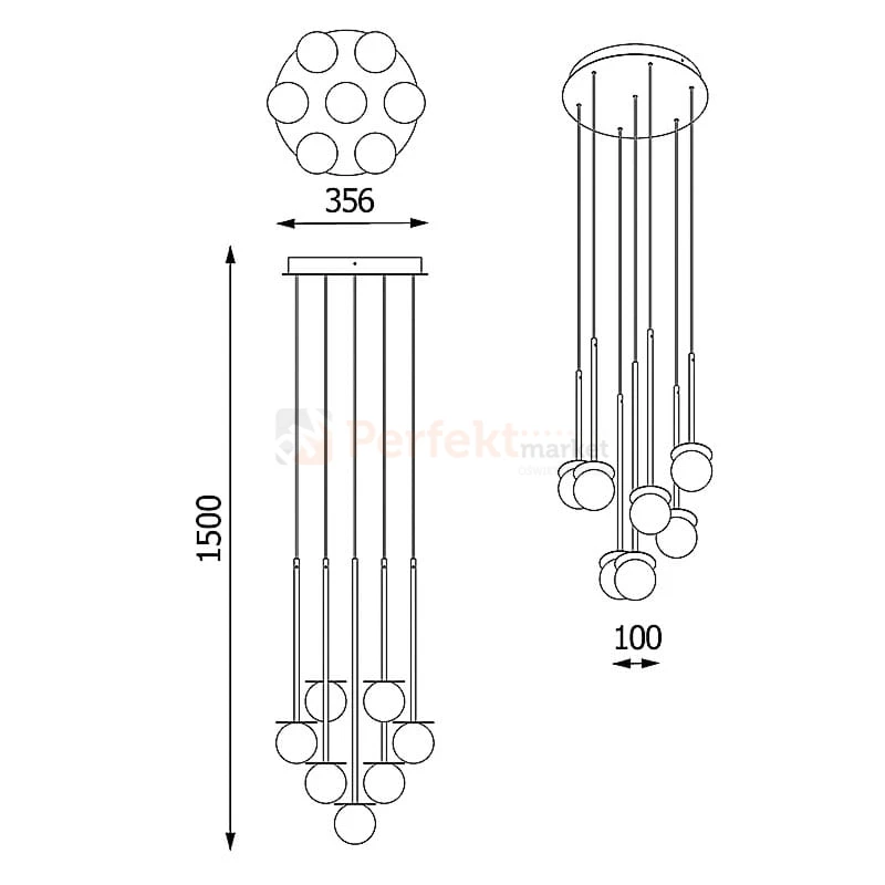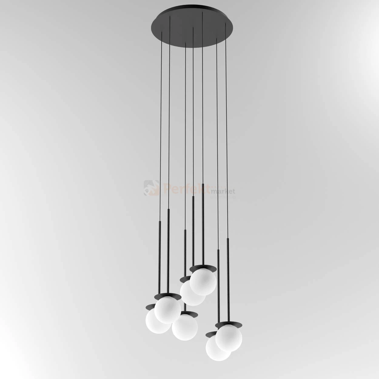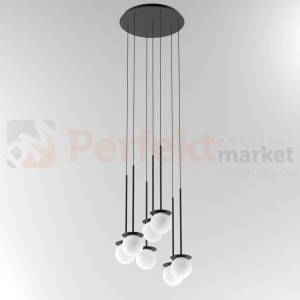 Lampa wisząca w formie siedmiu kulistych szklanych białych kloszy z czarnym wykończeniem. Jej elegancki design pięknie komponuje się we wszystkich wnętrzach dodając im blasku. Czarny przewód ze stalowym zawiesiem o długości 150 cm. Istnieje możliwość regulacji długości przewodu.