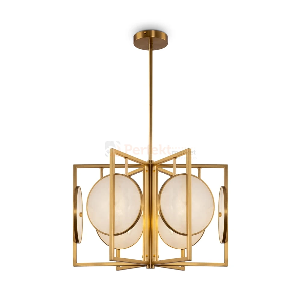 Klasyczna, stylowa lampa wisząca, która oświetla przestrzeń dzięki zastosowaniu sześciu źródeł światła. Białe matowe klosze oplecione złotą ramką tworzą bogatą kompozycję, która wkomponuje się w jasne jak i ciemne wnętrze.