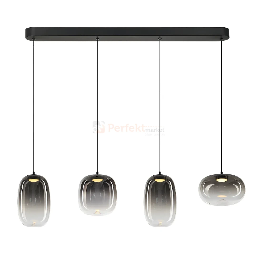 Lampa wisząca VASO 15W to wyjątkowa kompozycja czterech czarnych dymionych kloszy umieszczonych na eleganckiej, prostokątnej podsufitce. Inne kształty klosza tworzą dynamiczną i nowoczesną aranżację świetlną. Zastosowanie różnorodnych form w obrębie jednej oprawy nadaje jej niepowtarzalnego charakteru i sprawia, że staje się efektownym punktem każdego wnętrza. Wbudowany moduł LED o łącznej mocy 15W generuje ciepłe światło o temperaturze barwowej 3000K, tworząc przyjemną atmosferę. Strumień świetlny lampy to 1698 lm. Kąt świecenia oprawy 120° gwarantuje optymalne doświetlenie przestrzeni, a możliwość regulacji wysokości zwisu pozwala na dopasowanie do indywidualnych potrzeb. Idealna do salonu, nad stół w jadalni lub jako centralny element dekoracyjny w nowoczesnych wnętrzach.