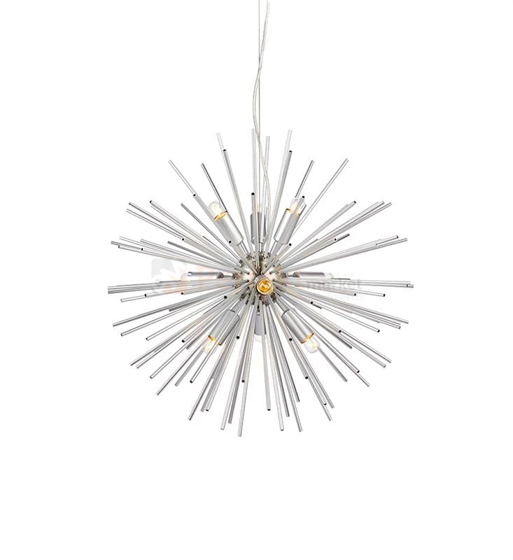 Rozłożysta konstrukcja o efektownym wzornictwie. Niesamowity efekt kuli z srebrnymi rurkami. Lampa doskonale wkomponuje się w różne style wyposażenia wnętrz. Połączenie wielu stalowych złotych elementów przypomina świecące słońce.