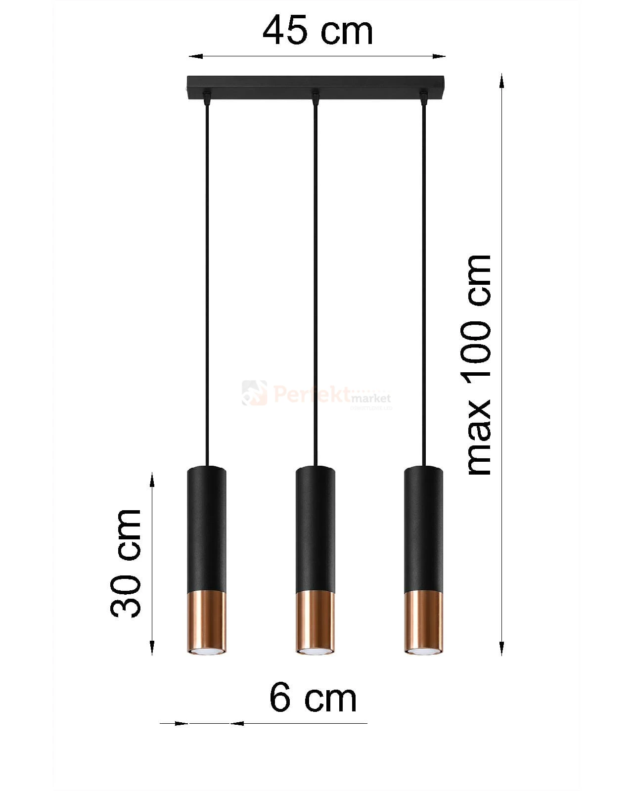 Źródło światła: GU10, 3x40W, 50Hz, 220V, IP20 Źródło światła nie jest w komplecie. Wymiary: 20/20/90 cmWymiary klosza: 6/29 cm Materiał: stal Kolor: czarny, złoty