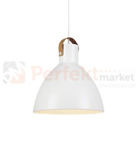 Skandynawska lampa wisząca w formie okrągłego białego klosza z elementem wykończeniowym o wyglądzie brązowej skóry. Jej klasyczny design pięknie komponuje się we wszystkich wnętrzach. Przewód o długości 150 cm w kolorze białym. Istnieje możliwość regulacji długości przewodu.