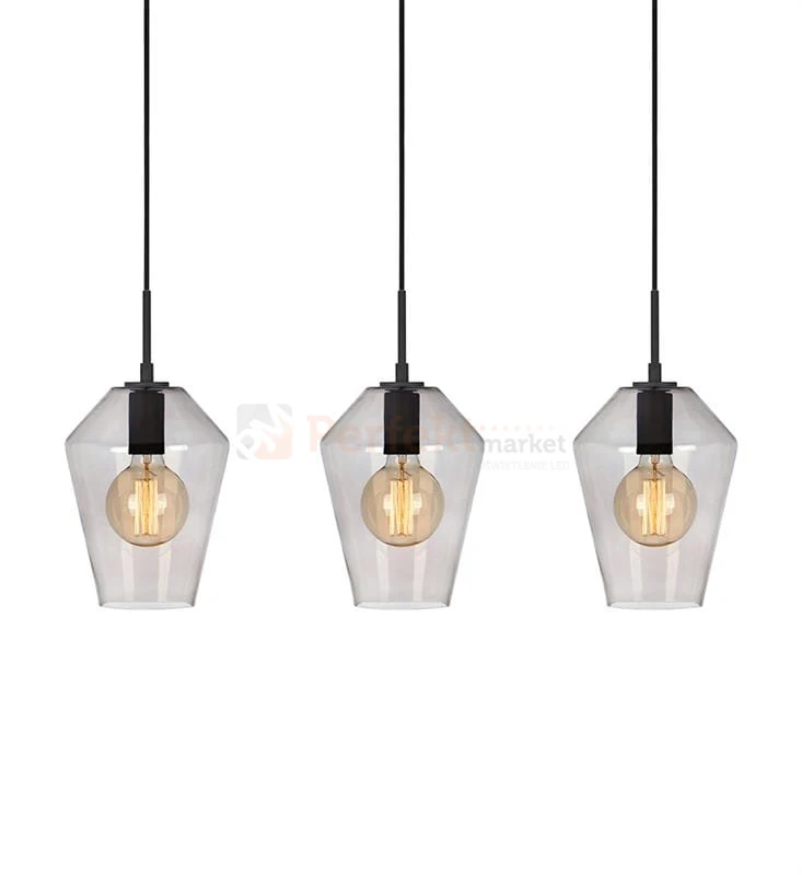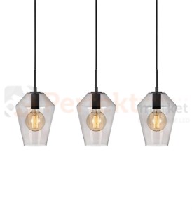 Lampa wisząca w formie trzech szklanych kloszy z czarnym wykończeniem. Jej elegancki design pięknie komponuje się we wszystkich wnętrzach dodając im charakteru. Transparentne przewody ze stalowymi zawiesiami o długości 150 cm. Istnieje możliwość regulacji długości przewodów.