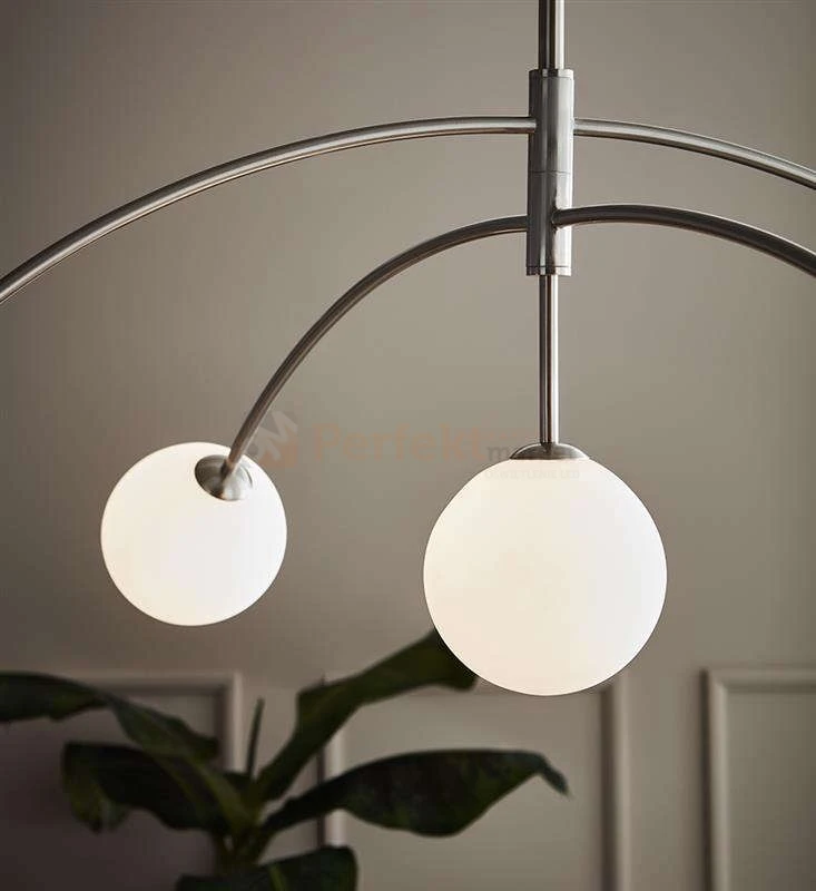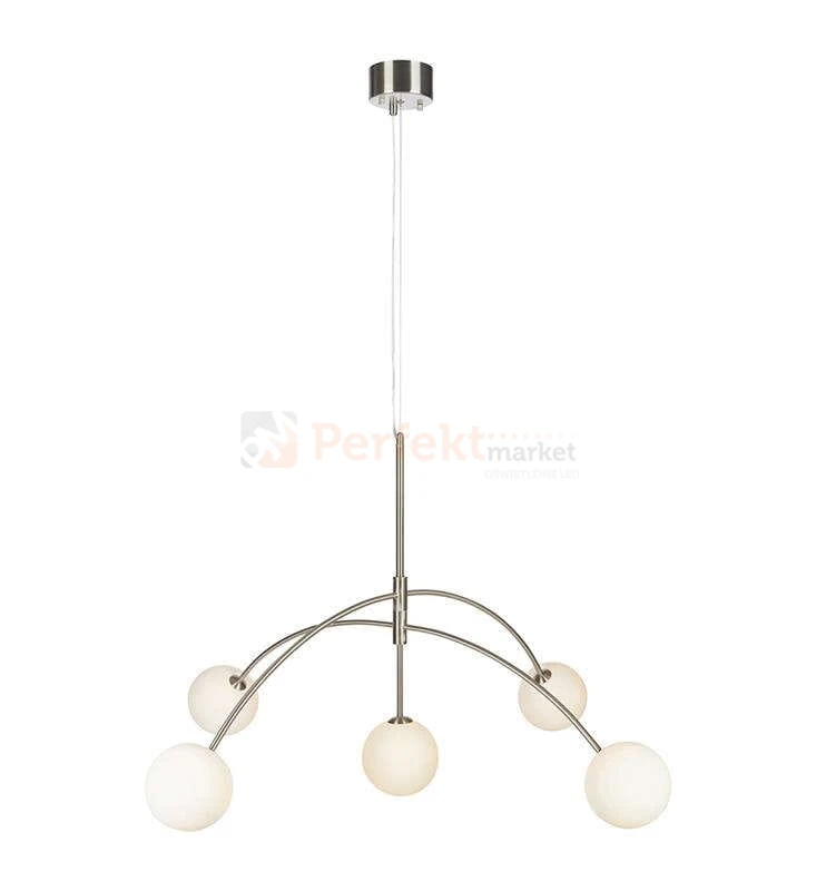 Lampa wisząca w formie pięciu kulistych szklanych białych kloszy z chromowanym wykończeniem. Jej elegancki design pięknie komponuje się we wszystkich wnętrzach dodając im blasku. Czarny przewód ze stalowym zawiesiem o długości 120 cm. Istnieje możliwość regulacji długości przewodu.