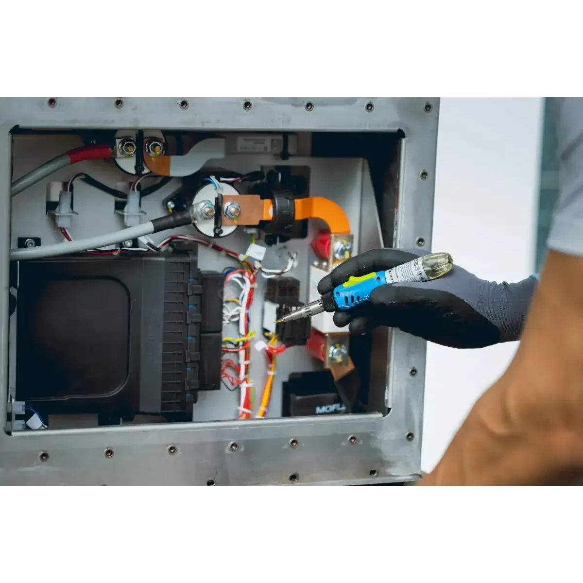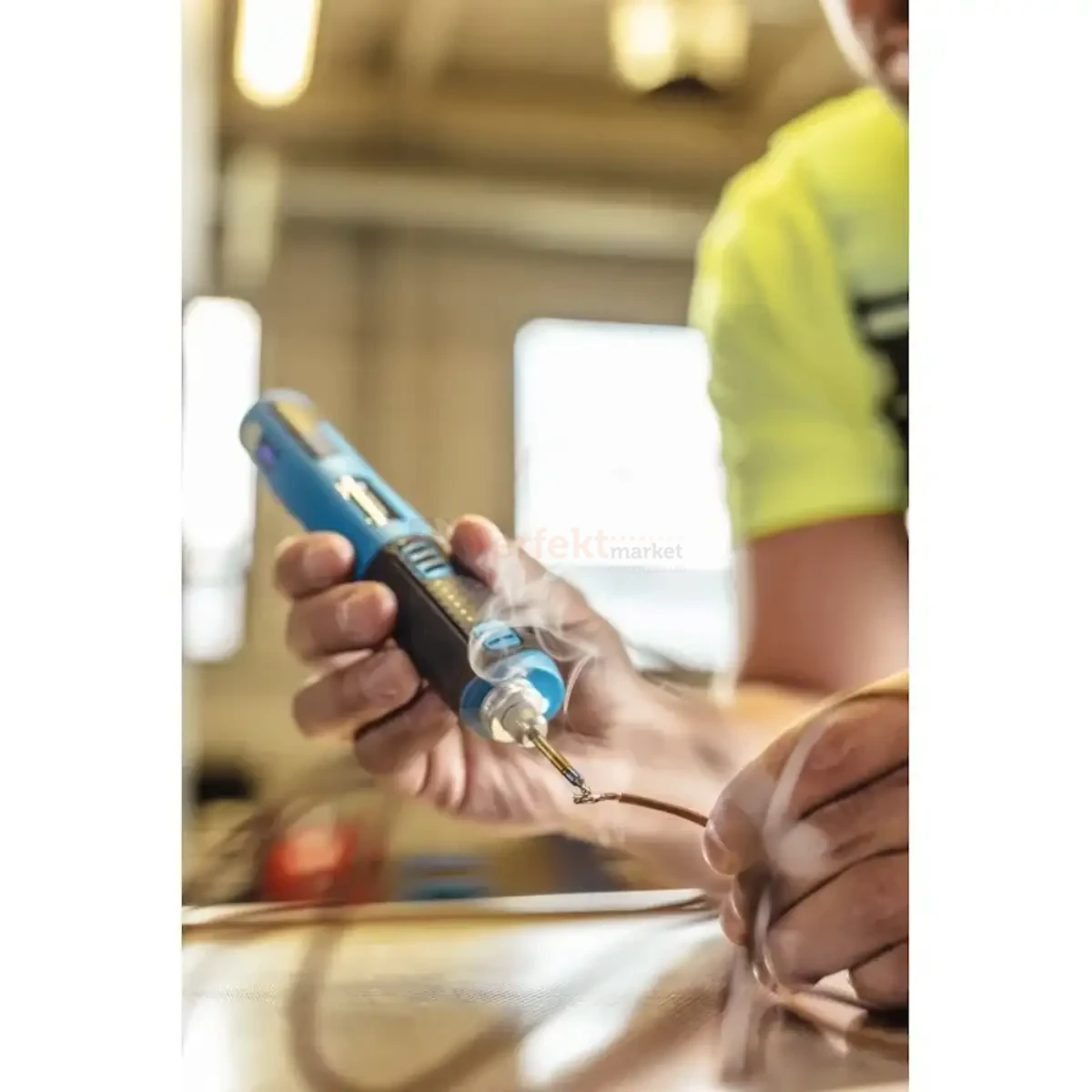 Poręczna i mobilna lutownica akumulatorowa przeznaczona do lutowania miękkiego metali przy użyciu spoiw cynowych lub cynowo-ołowiowych. Dzięki zasilaniu akumulatorem litowo-jonowym 4V o pojemności 1500 mAh urządzenie zapewnia swobodę pracy bez konieczności podłączenia do sieci. Czas ładowania wynosi zaledwie 2,5-3 godzin, a ładowanie odbywa się wygodnie za pomocą przewodu USB-C i dowolnej ładowarki (brak w zestawie) o zalecanym prądzie ładowania 1000-2000 mAh.