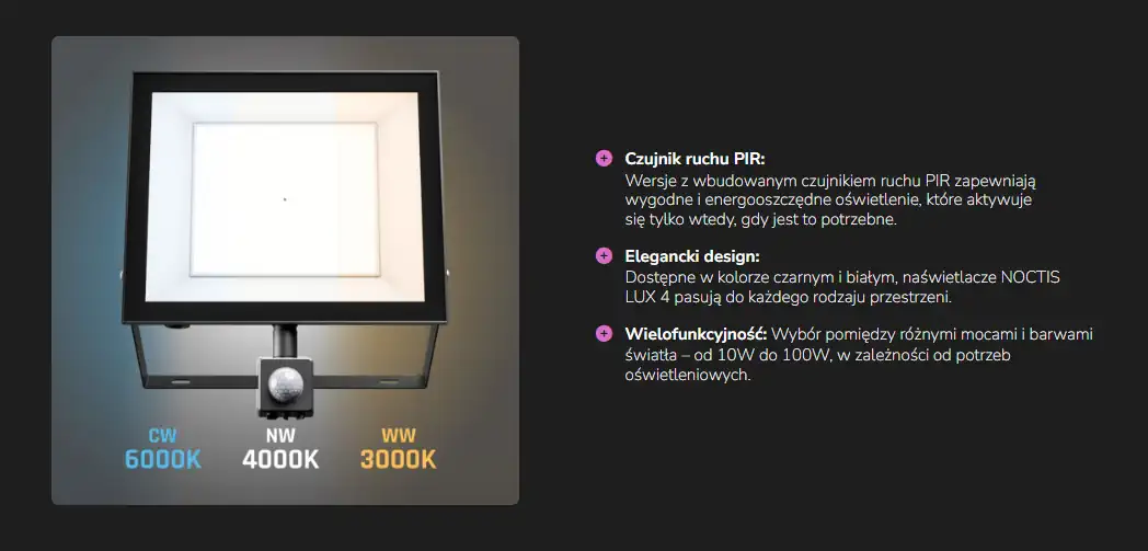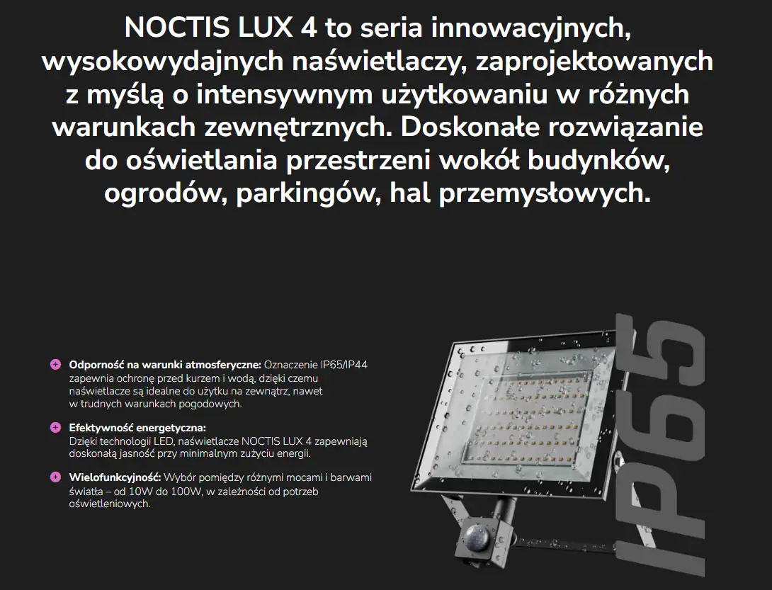 Noctis Lux 4 to seria nowoczesnych naświetlaczy LED zaprojektowanych do pracy w wymagających warunkach zewnętrznych. Łączą wysoką wydajność świetlną z solidną konstrukcją i elegancki design.
