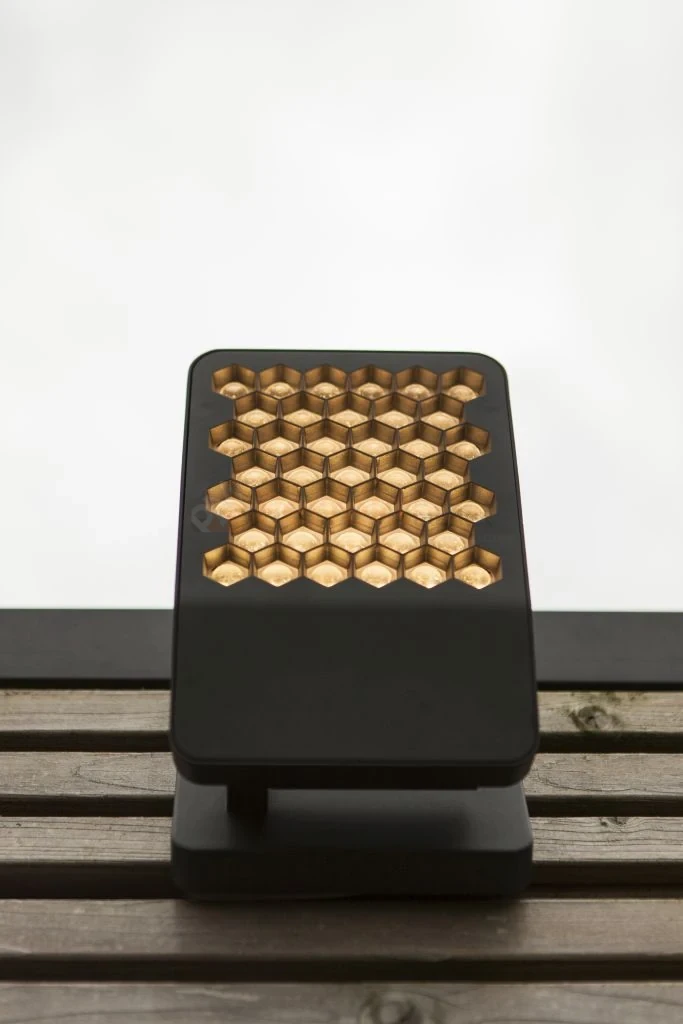 Lampa dostępna jest w eleganckim ciemnoszarym kolorze, który doskonale komponuje się z nowoczesnymi aranżacjami przestrzeni zewnętrznych. Zastosowane przezroczyste dyfuzory z kompozytu PC w unikalnym kształcie plastra miodu zapewniają optymalne rozproszenie światła, zwiększając jego estetykę oraz skuteczność oświetleniową.