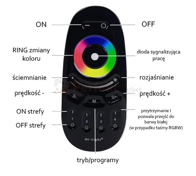 Łączenie pilota z odbiornikiem: podłącz zasilanie do odbiornika i w ciągu 3 sekund naciśnij guzik strefy (1, 2, 3, lub 4) na pilocie, w zależności z którą strefą chcesz sparować odbiornik. Taśma zamruga 3 razy. Gotowe.
