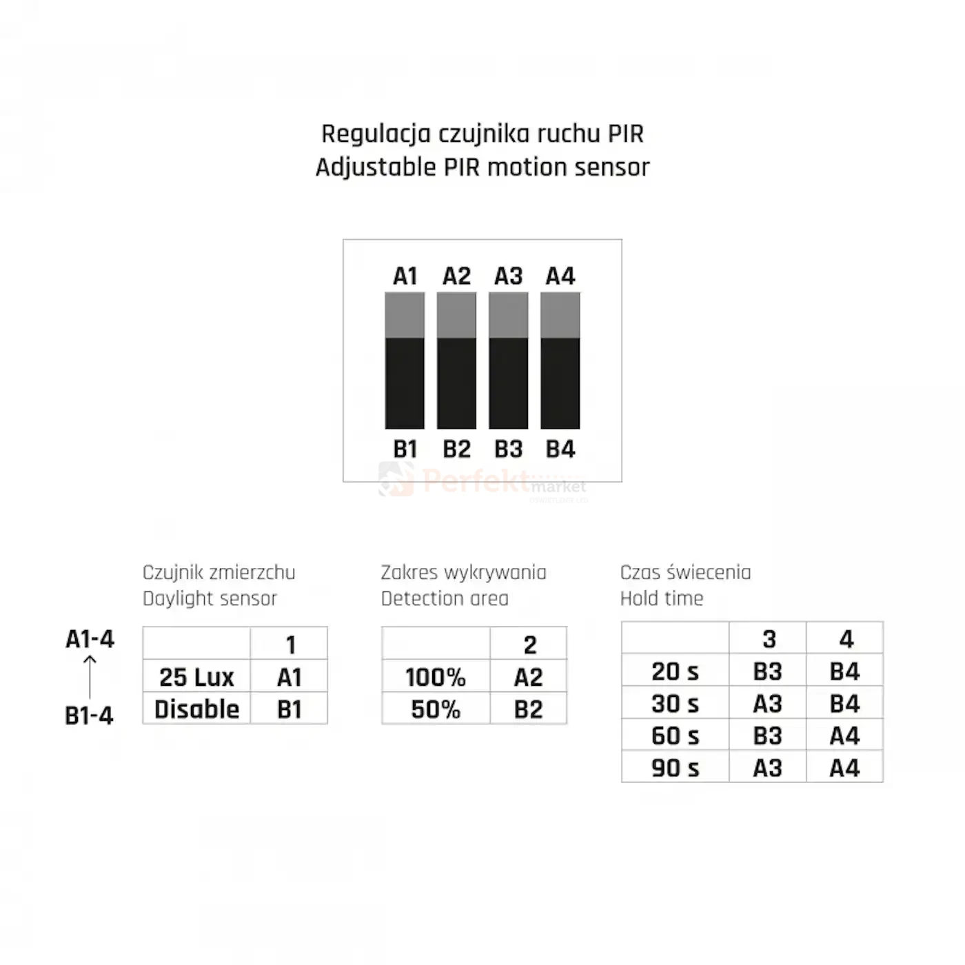 Wbudowany czujnik posiada regulację na zasadzie przestawnych zworek, za ich pomocą możemy regulować czujnik zmierzchu - włacz/wyłacz 25 lux, zakres wykrywania - 50% oraz 100%, a także czas w zakresie 20 sek - 90 sek.