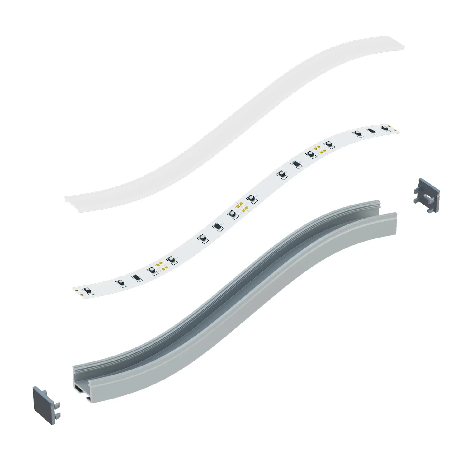 FLEXA to zaawansowany profil LED do montażu natynkowego, stworzony z myślą o realizacjach, w których liczą się płynne łuki, nietypowe kształty i pełna swoboda projektowania. Dzięki konstrukcji umożliwiającej gięcie w obu płaszczyznach bez kompromisów odwzorujesz nawet złożone formy architektoniczne — od delikatnych krzywizn po bardziej wymagające geometrie.