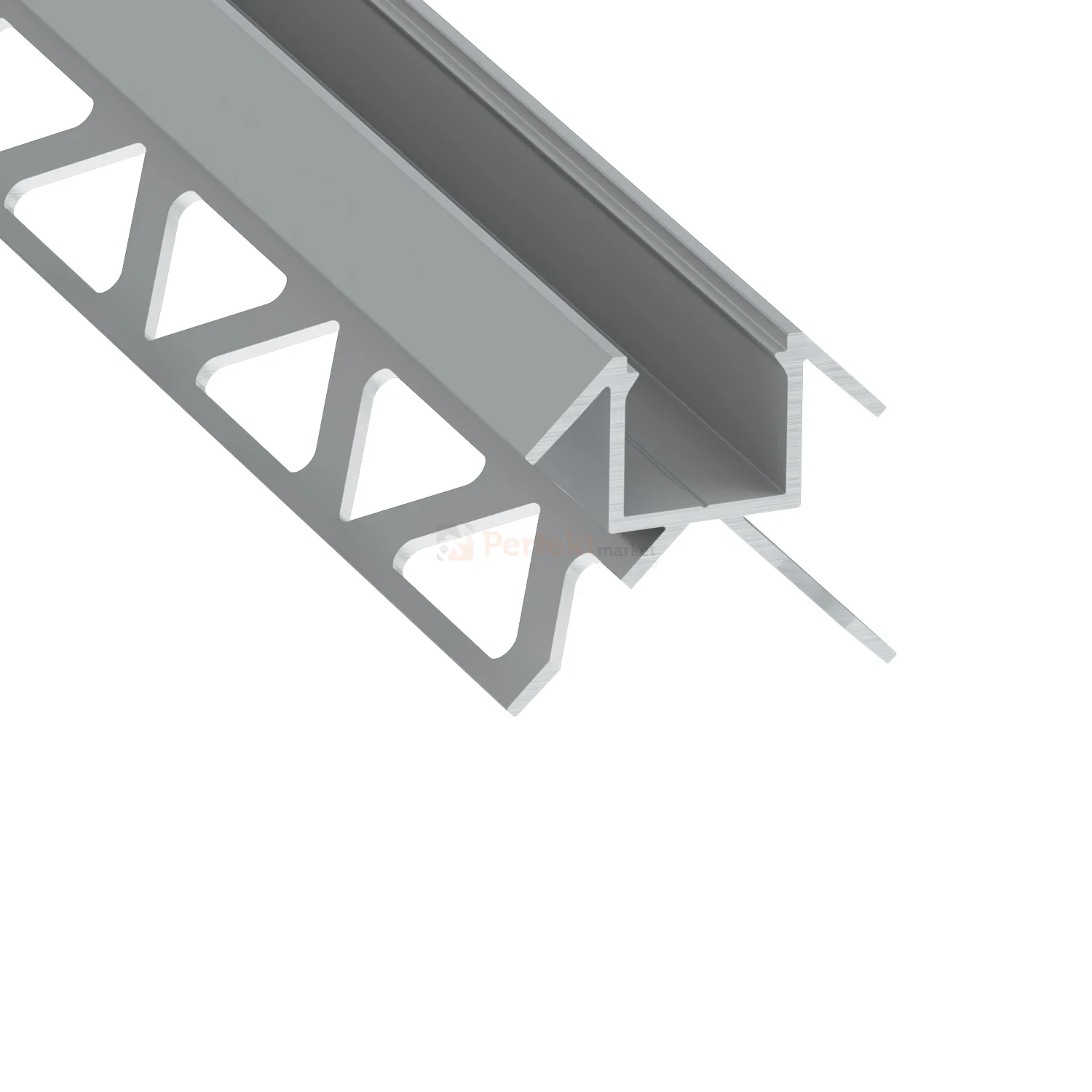 Profil osadza się bezpośrednio w kleju pod płytką. Perforowane, trójkątne skrzydełka poprawiają przyczepność, stabilizują okładzinę i ułatwiają prawidłowy montaż.