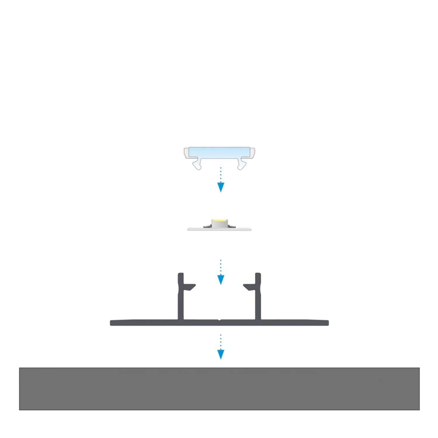 Schemat złożenia elementów systemu oświetleniowego z wykorzystaniem profilu NIPO oraz (1) klosza podłogowego, (2) taśmy LED, (3) zaślepki z otworem