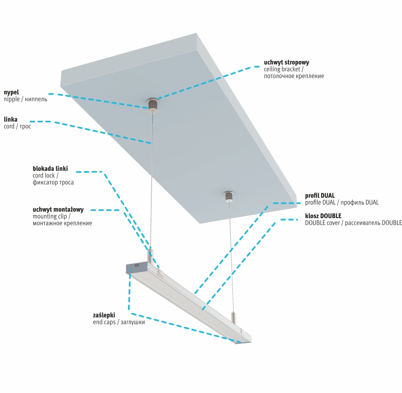 Przykład wykorzystania profilu DUAL z kloszem DOUBLE z uchwytem montażowym DUAL oraz systemem uchwytów, nypli zawiesi (do kupienia osobno)