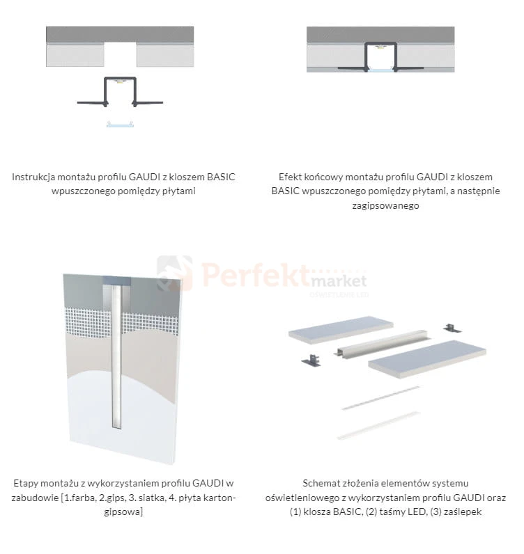 Profil aluminiowy biały lakierowany do taśm LED wpuszczany do obróbki gładzią, szpachlą, tynkiem. Konstrukcja profilu GAUDI umożliwia jego montaż w płytach Regips, ścianach, sufitach betonowych uzyskując efekt widocznego tylko klosza.