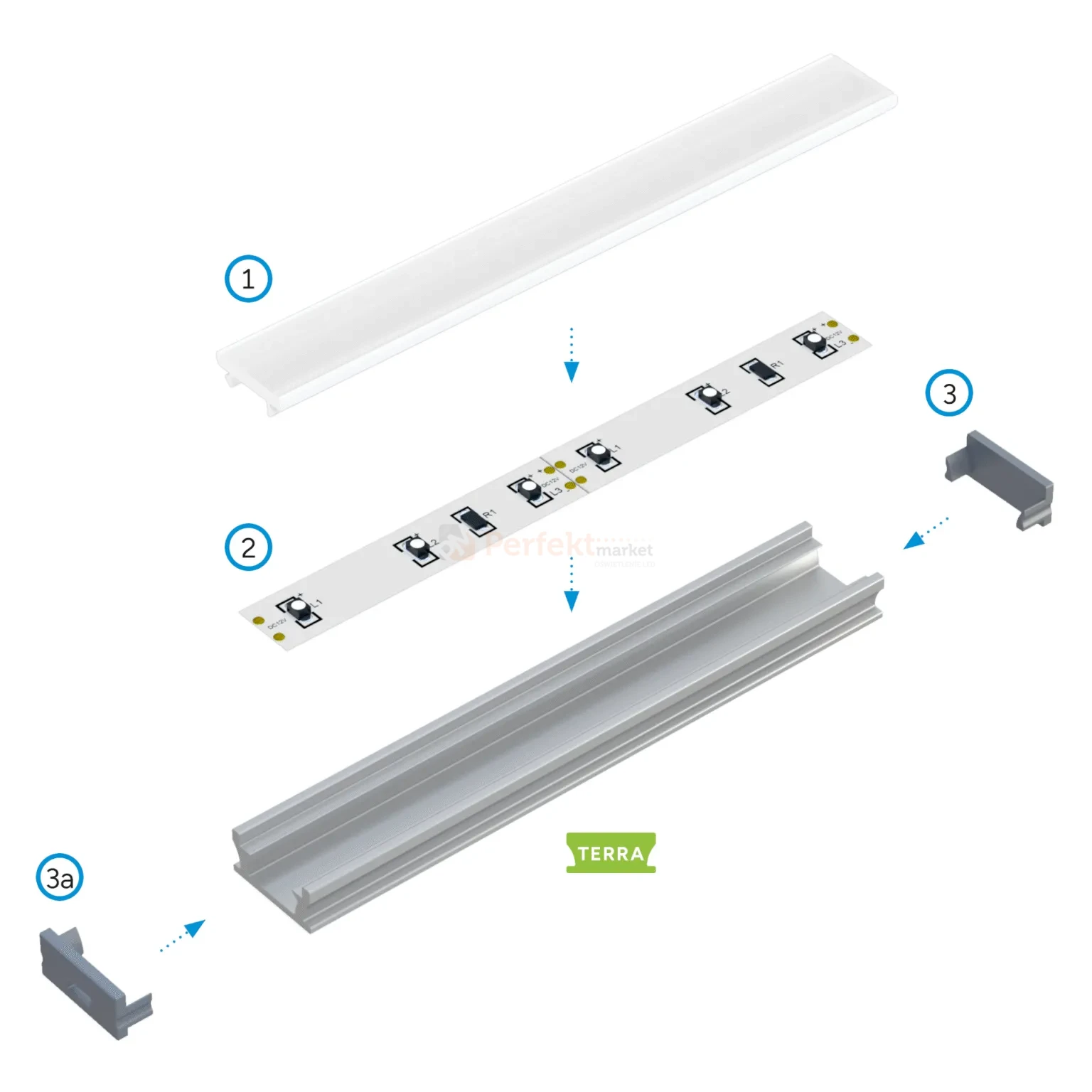 Schemat złożenia elementów systemu oświetleniowego z wykorzystaniem profilu TERRA oraz (1) klosza podłogowego, (2) taśmy LED, (3) zaślepki bez otworu, (3a) zaślepki z otworem: