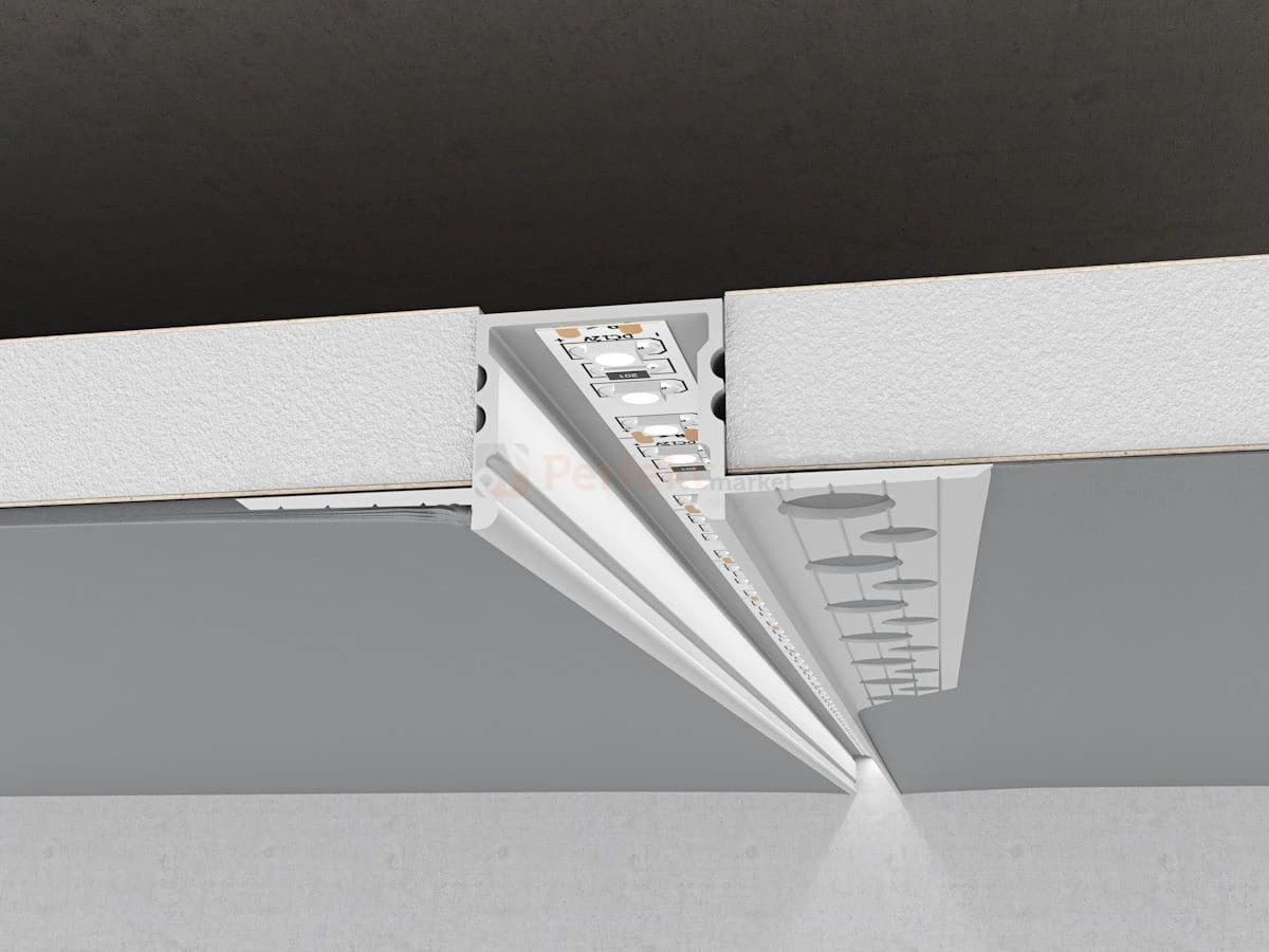 Srebrny profil aluminiowy do taśm LED wpuszczany do obróbki gładzią, szpachlą, tynkiem. Konstrukcja profilu GK18-3 umożliwia jego montaż w płytach Regips, ścianach, sufitach betonowych uzyskując efekt linii świetlnej i widocznego tylko klosza.