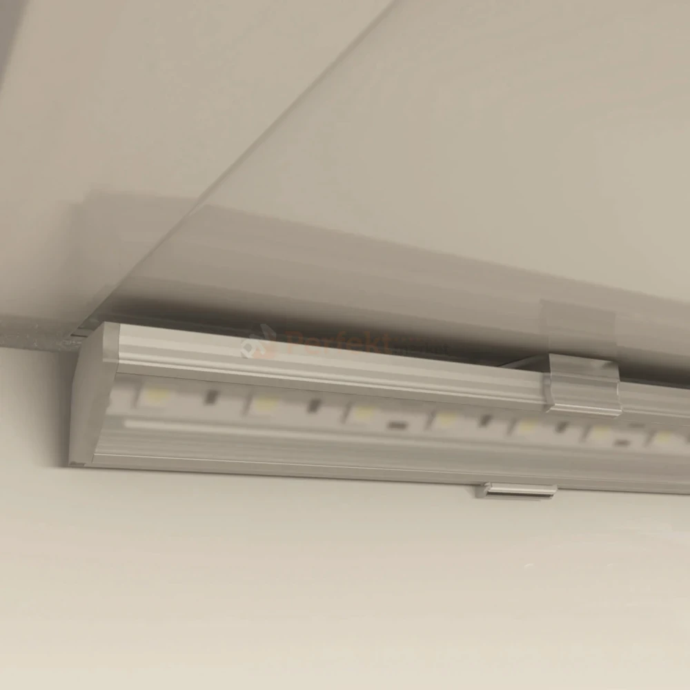 Narożna konstrukcja oraz ustawienie taśmy pod kątem 45° pozwalają efektownie ukierunkować światło i subtelnie podkreślić linie wnętrza.