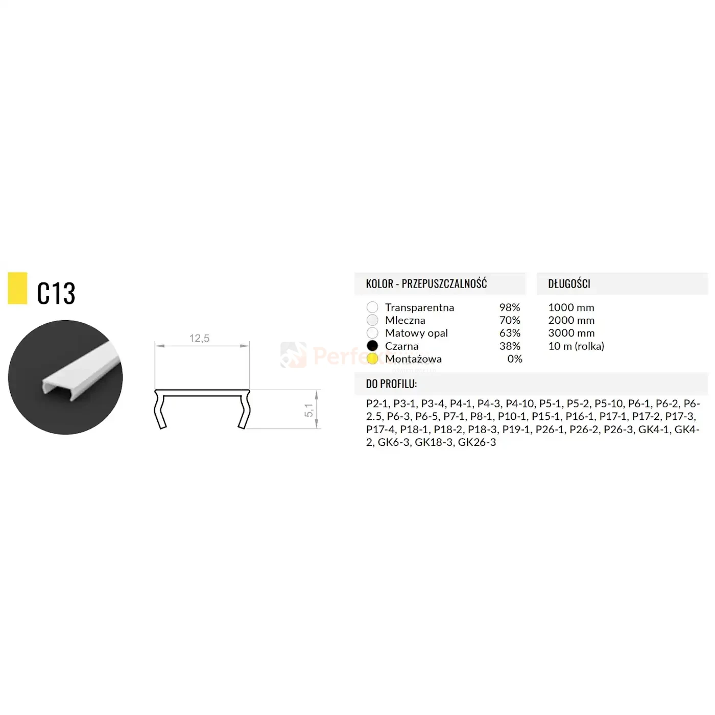 Klosz przeznaczony do montażu w profilach LED P2-1, P3-1, P3-4, P4-1, P4-3, P4-10, P5-1, P5-2, P5-10, P6-1, P6-2, P6- 2.5, P6-3, P6-5, P7-1, P8-1, P10-1, P15-1, P16-1, P17-1, P17-2, P17-3, P17-4, P18-1, P18-2, P18-3, P19-1, P26-1, P26-2, P26-3, GK4-1, GK4- 2, GK6-3, GK18-3, GK26-3