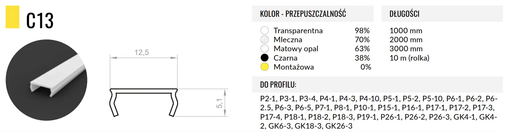 Klosz przeznaczony do montażu w profilach LED P2-1, P3-1, P3-4, P4-1, P4-3, P4-10, P5-1, P5-2, P5-10, P6-1, P6-2, P6- 2.5, P6-3, P6-5, P7-1, P8-1, P10-1, P15-1, P16-1, P17-1, P17-2, P17-3, P17-4, P18-1, P18-2, P18-3, P19-1, P26-1, P26-2, P26-3, GK4-1, GK4- 2, GK6-3, GK18-3, GK26-3