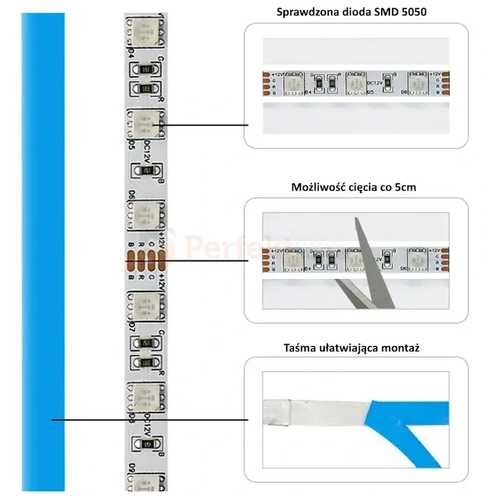 Taśmę można ciąć co 10 cm we wskazanych na podkładzie miejscach. Jej montaż ułatwia taśma dwustronnie klejąca