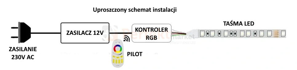 Do taśm LED RGB wymagany jest sterownik (kontroler) RGB 24V oraz zasilacz o stabilizowanym napięciu 24V DC.