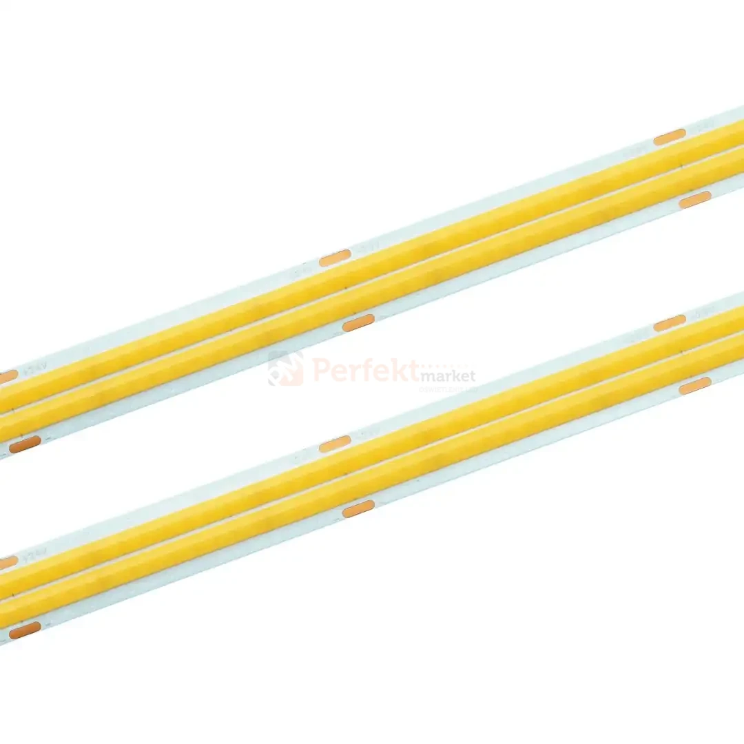 Taśma LED COB LED na podwójnym podkładzie PCB 2oz to jeden z najnowszych modeli taśm. Dzięki bardzo dużej ilości diod, możliwe jest uzyskanie jednolitej linii świetlnej nawet przy niskich profilach aluminiowych. Dzięki podwójnemu równoległemu ułożeniu dwóch linii świetlnych uzyskano wyższą moc i większy strumień świetlny taśmy - 2070lm/m przy zachowaniu stosunkowo wąskiej taśmy - 12mm. Dzięki niewielkim wymiarom taśma bez problemu zmieści się w większości profil aluminiowych oferowanych w naszym sklepie.