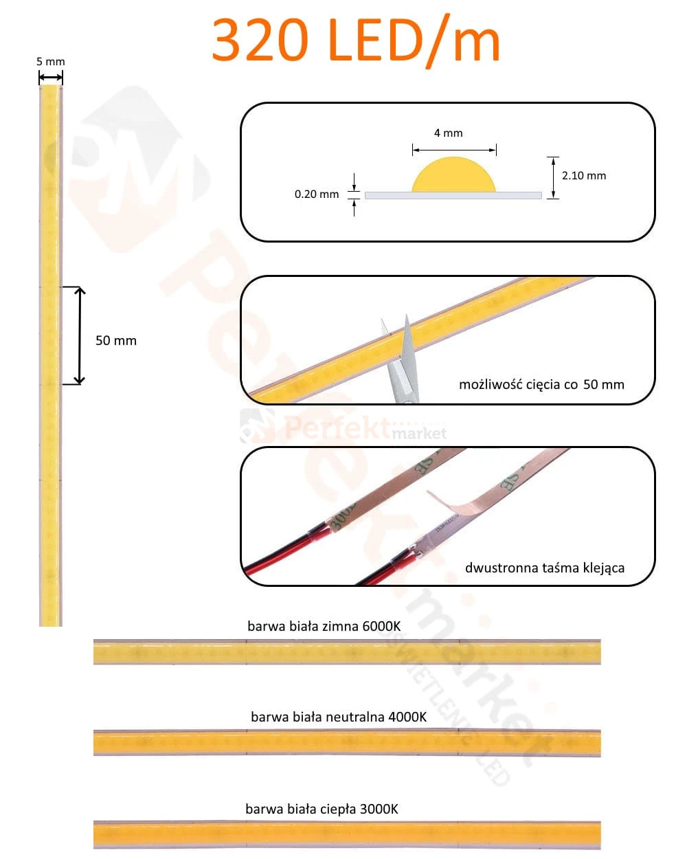 Taśma LED ultra slim 5mm COB LED 24V 10W linia świetlna IP20 [krążek 5m] [warianty]