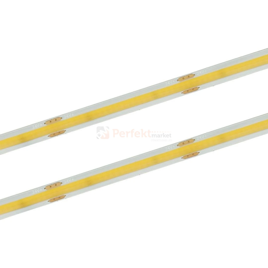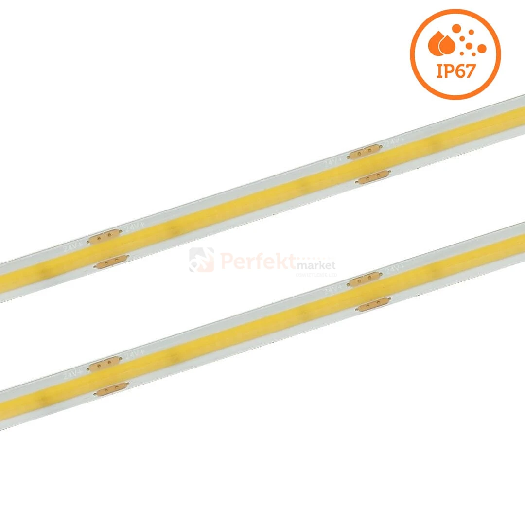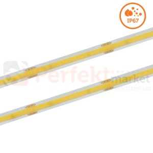 Wodoodporna taśma LED COB LED na podwójnym podkładzie PCB 2oz to jeden z najnowszych modeli taśm. Dzięki bardzo dużej ilości diod, możliwe jest uzyskanie jednolitej linii świetlnej nawet przy niskich profilach aluminiowych. Wysoki współczynnik oddawania barw CRI Ra>90 gwarantuje idealne odwzorowanie kolorów oświetlanych przedmiotów, wnętrz.