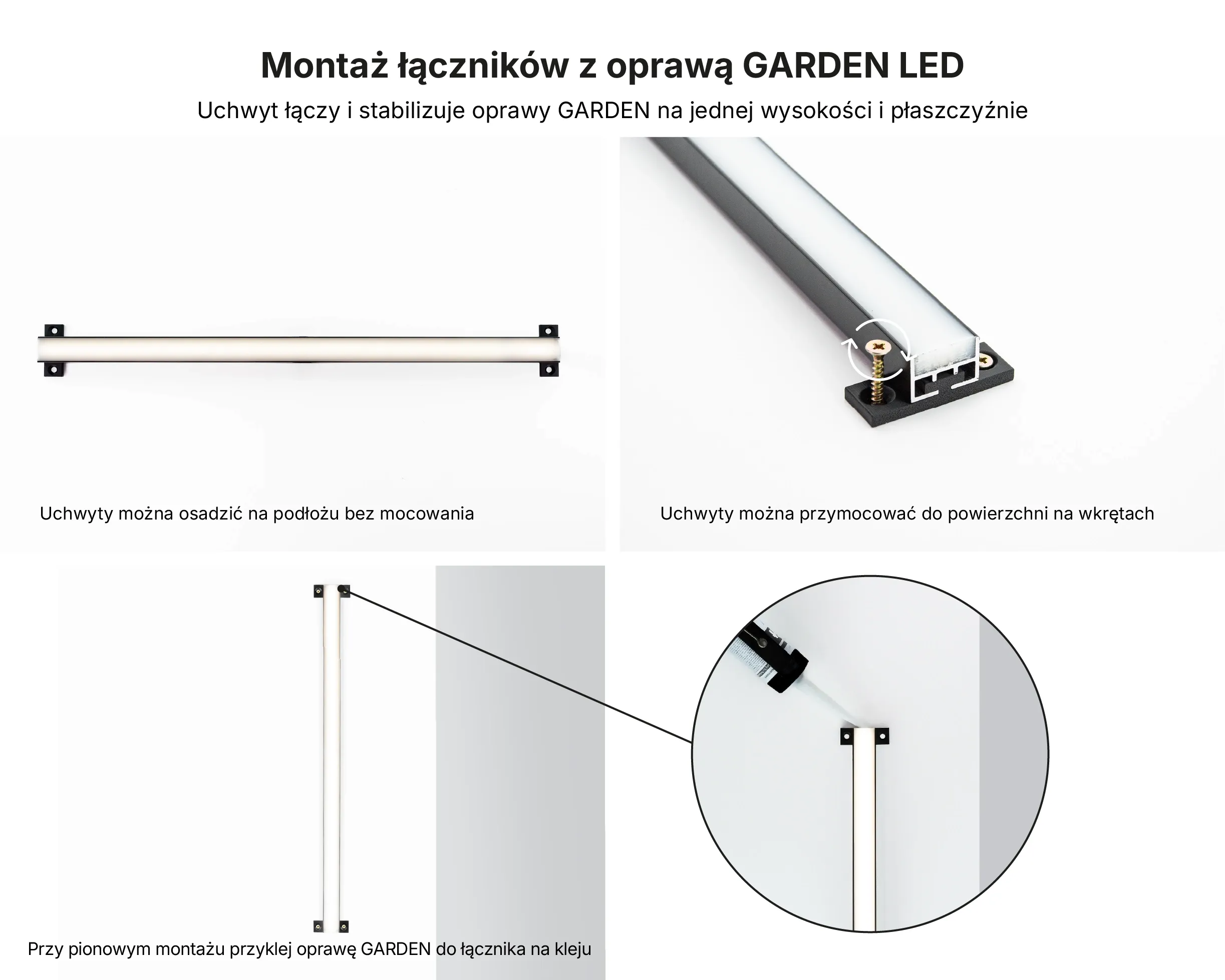 Łącznik do opraw LED Garden to wygodne rozwiązanie umożliwiające montaż opraw na różnych powierzchniach i tworzenie z nich dłuższych ciągów świetlnych. Produkt jest precyzyjnie wykonany i idealnie pasuje do serii Garden. Zapewnia mocne połączenie i jednolity wygląd całej instalacji. Pozwala stworzyć nieprzerwane linie światła które nadają nowoczesny charakter ogrodowi lub tarasowi. Uchwyty montażowe służą do bezpiecznego mocowania opraw i jednocześnie łączenia ich w dłuższe sekcje. System Garden jest dzięki temu elastyczny i łatwy w montażu bez względu na potrzeby projektu. Instalacja łączników przebiega szybko i prosto. Można je zamontować używając kołków rozporowych lub kleju montażowego. Taki sposób pozwala dostosować metodę do typu podłoża takiego jak beton lub drewno albo kostka brukowa czy metal.