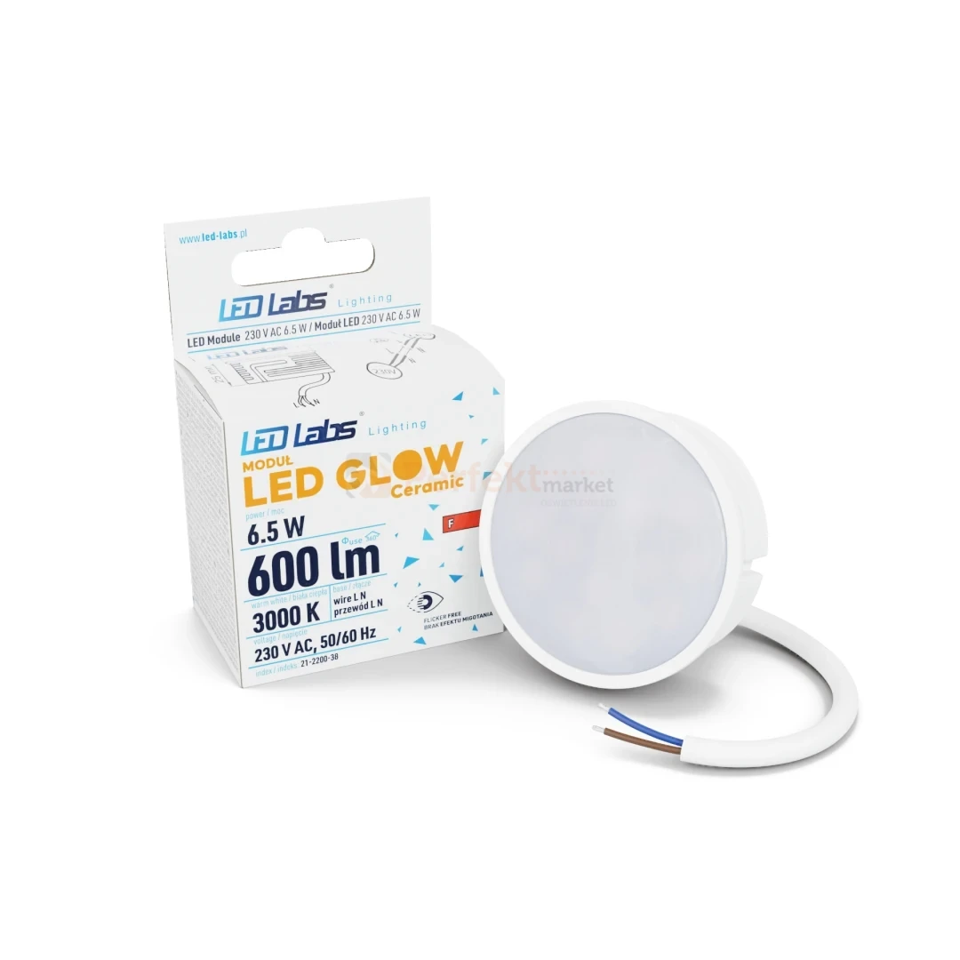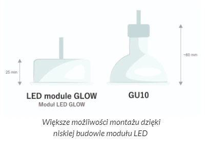 Ze względu na swoją średnicę (jak standardowa lampa LED GU10) moduł LED GLOW może być stosowany również w klasycznych oprawach sufitowych. Podłączenie do napięcia 230V należy wykonać za pomocą złączek elektrycznych np. WAGO.