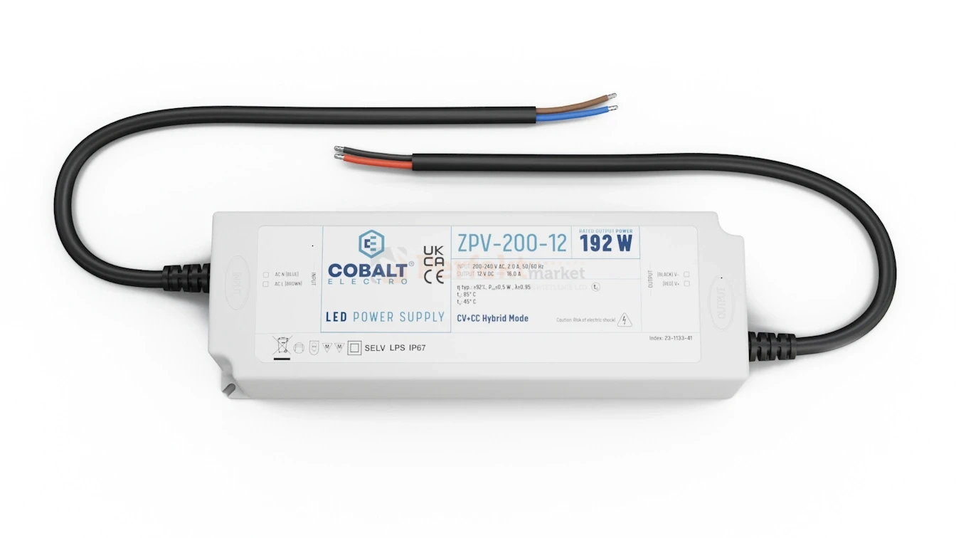 Seria stałonapięciowych zasilaczy ZPV hermetycznych dzięki klasie ochrony IP67 jest przeznaczona do instalacji zewnętrznych oraz do pomieszczeń, gdzie mamy do czynienia z wysokim poziomem wilgotności. Zasilacz przemienia prąd sieciowy 230V na napięcie stałe 12V, które jest wymagane między innymi do instalacji oświetlenia LED.