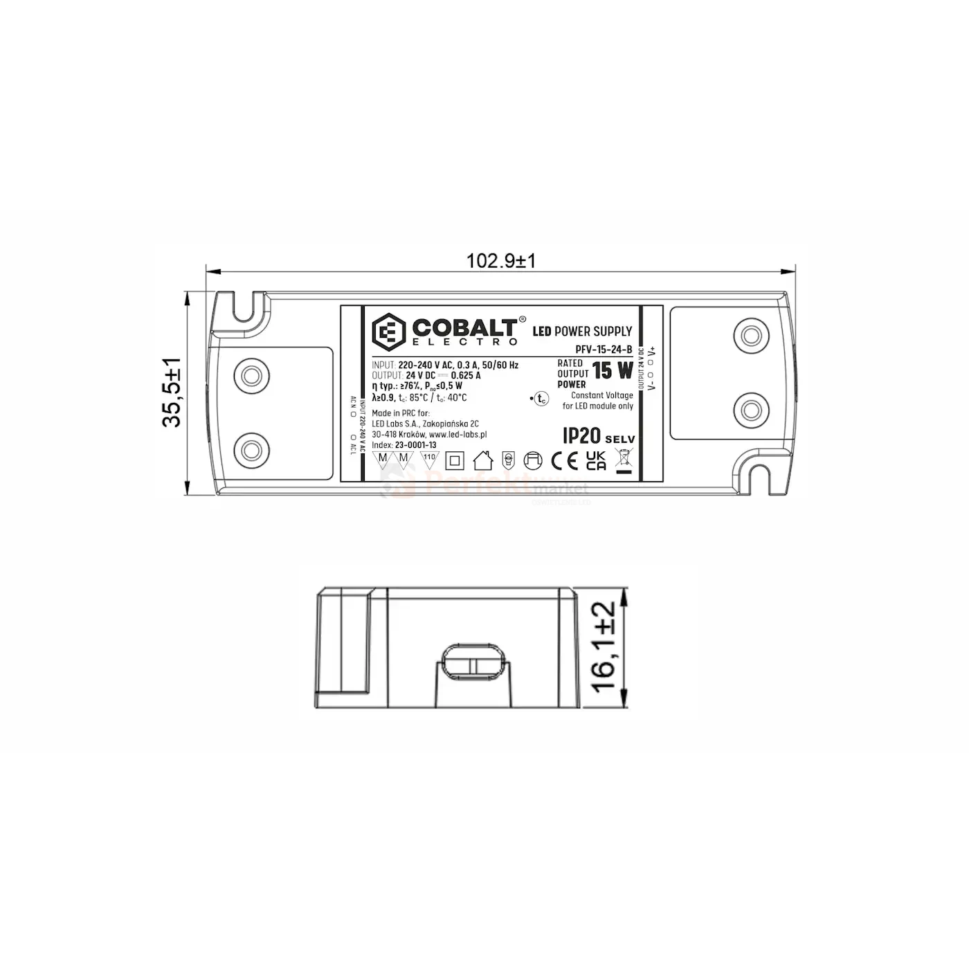 Seria stałonapięciowych zasilaczy meblowych PFV marki Cobalt Electro przeznaczona jest do instalacji wewnętrznych wszędzie tam gdzie rozmiar zasilacza ma znaczenie. Dzięki płaskiej obudowie i stosunkowo niewielkiej wadze, zasilacz znajdzie zastosowanie w najbardziej wymagających przestrzeniach. Poza niewielkim rozmiarem, zasilacz charakteryzuje wysoka sprawność i optymalny wzrost temperatury w czasie pracy, co przekłada się na zminimalizowanie zużycia energii elektrycznej oraz wydłuża żywotność zasilacza.