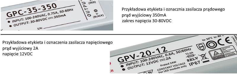 Zasilacz stałoprądowy utrzymuje stały prąd (np. 350 mA, 500 mA, 700 mA, 1050 mA), a napięcie wyjściowe dostosowuje w pewnym zakresie do łącznego spadku napięcia na diodach.