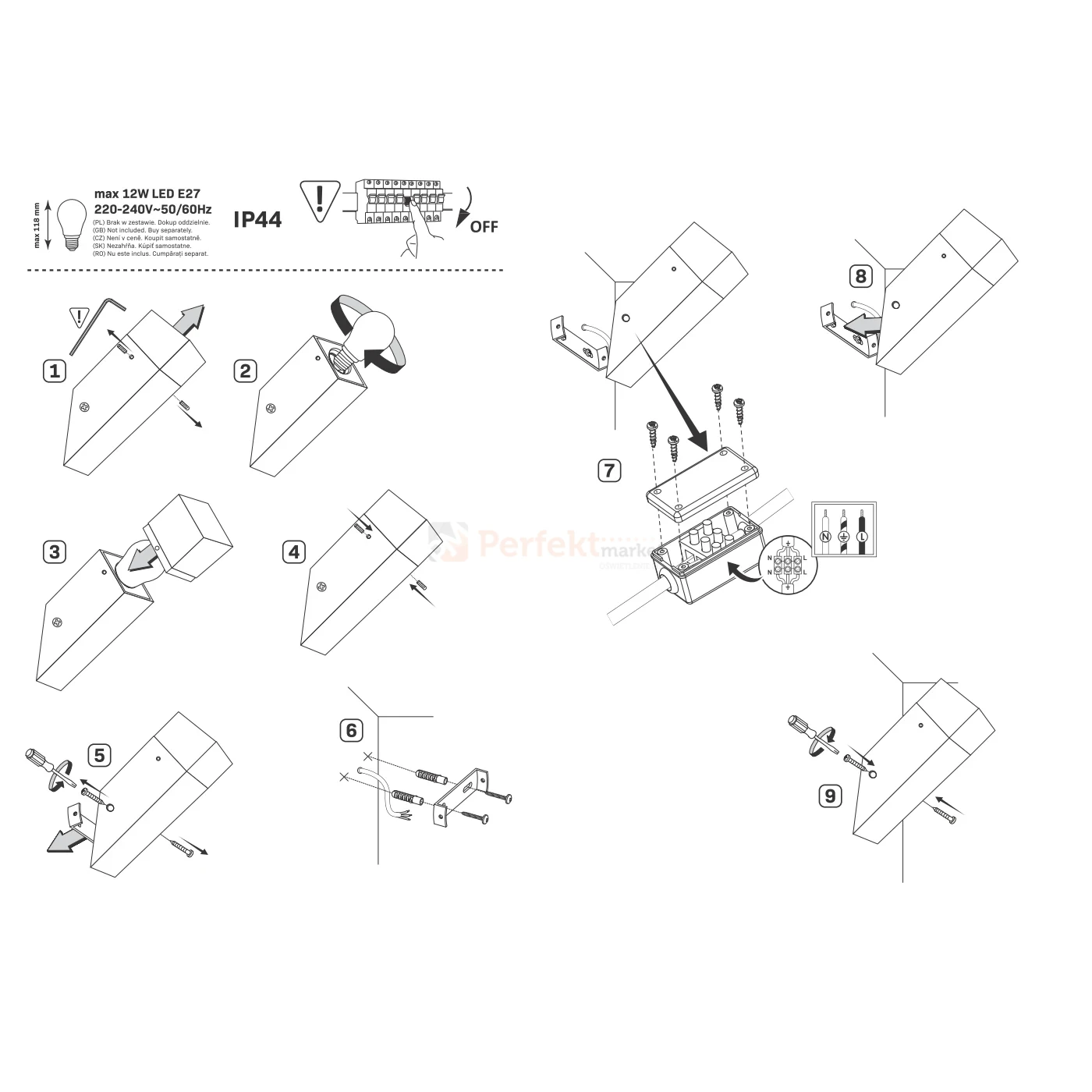 - Typ: lampa zewnętrzna ścienna