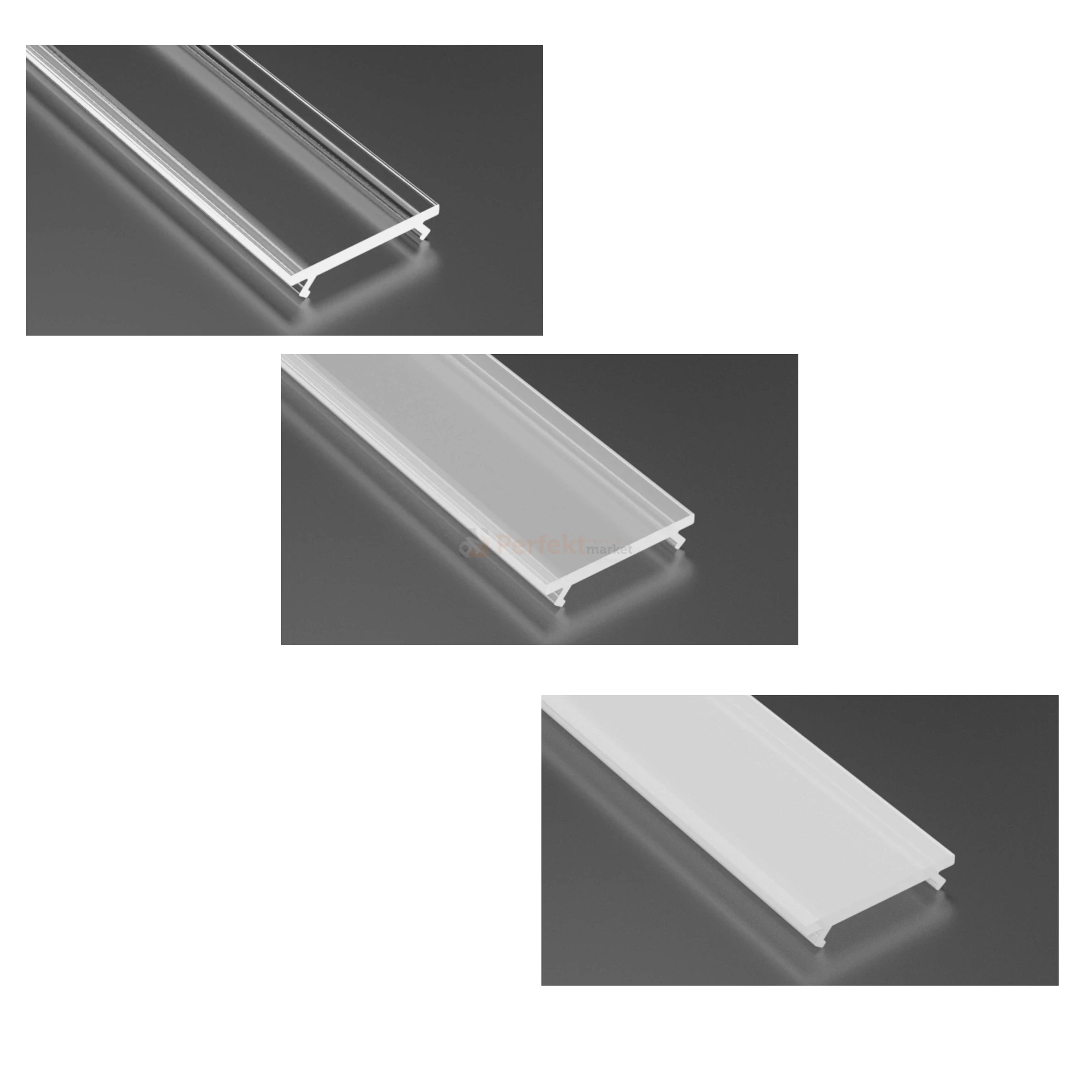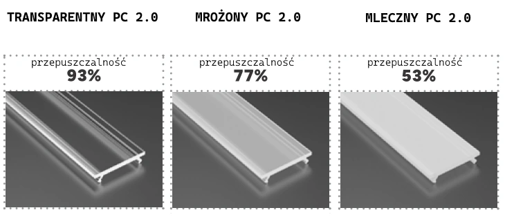 Klosze do profili LED 3 rodzaje: transparentny, mrożony, mleczny. Pasują do profili typu A, B, C, D, G, H, Y, Z, COSMO, RETO, TIANO, FLARO, APA 12, APA 16, IPA 12, IPA 16