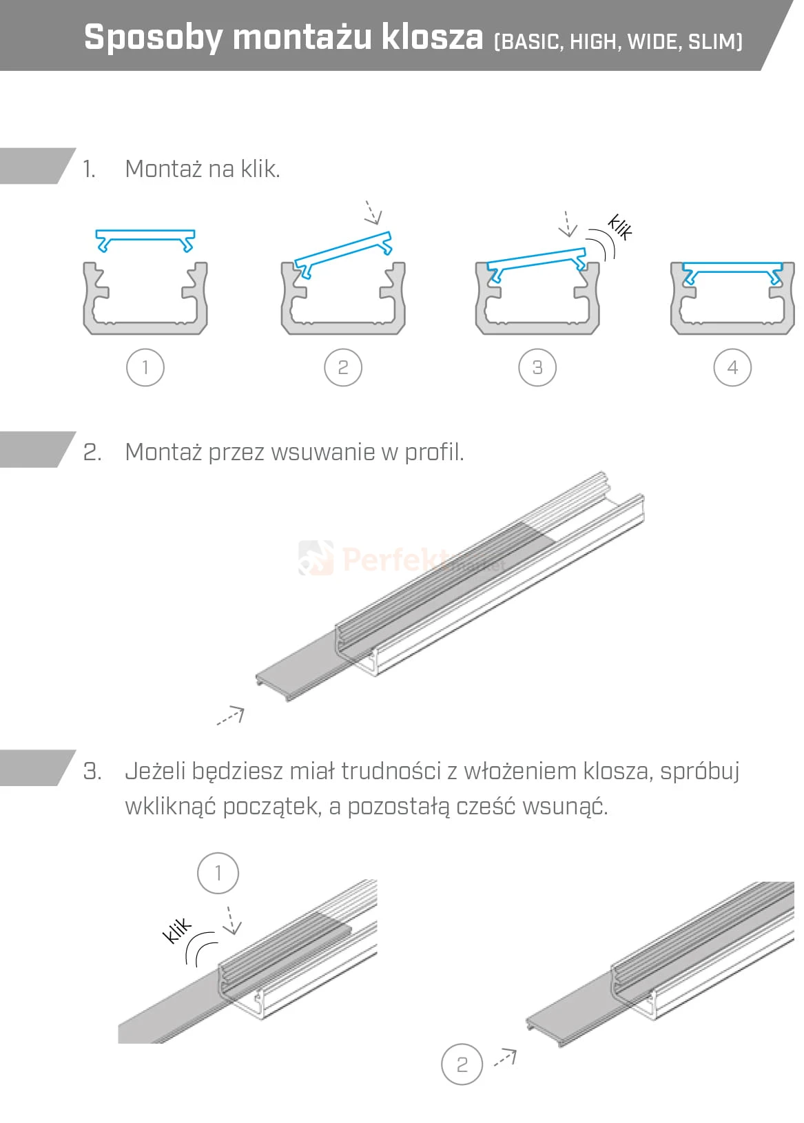 Klosze montowane są w bardzo prosty sposób - na wcisk od frontu profilu.