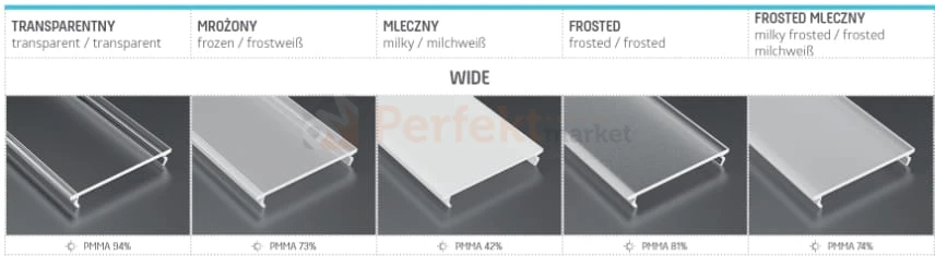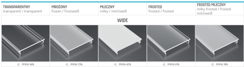 Klosz z tworzywa PMMA do szerokich profili LED wide firmy Lumines jest to płaska przesłonka dostępna w różnych odmianach stopnia przepuszczalności światła w zależności od zabielenia tworzywa.