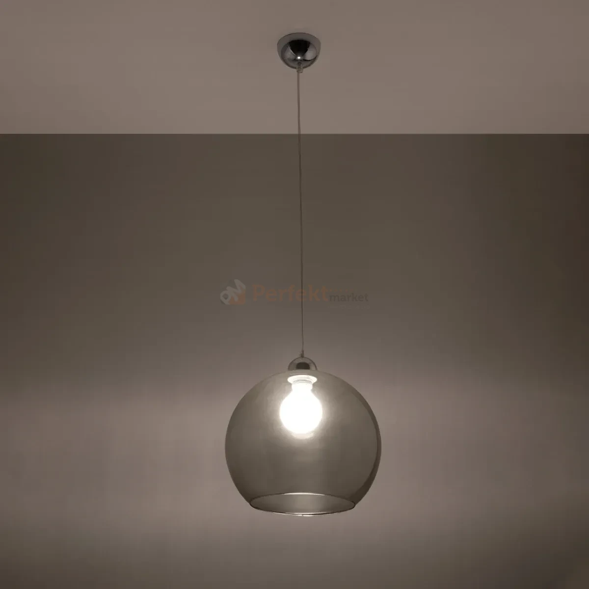 Szklany klosz w formie kuli równomiernie rozprasza światło, tworząc przyjemny efekt wizualny i zapewniając dobre doświetlenie pomieszczenia.